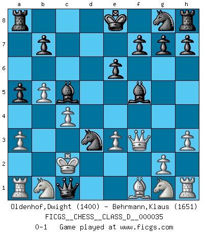 Last move : 0-1 2007 March 22 12:23:38 [Event "FICGS__CHESS__CLASS_D__000035"] [Site "FICGS"] [Date "2007.03.07"] [Round "1"] [White "Oldenhof,Dwight"] [Black "Behrmann,Klaus"] [Result "0-1"] [WhiteElo "1400"] [BlackElo "1651"] 1.e4 c6 2.d4 d5 3.e5 Bf5 4.h3 e6 5.a3 Nd7 6.b4 a5 7.b5 c5 8.c4 cxd4 9.Qxd4 Bc5 10.Qd1 Qh4 11.Qe2 Nxe5 12.Be3 Nd3+ 13.Kd2 d4 14.Qf3 dxe3+ 15.fxe3 Qe1+ 16.Kc2 Qc1+ 0-1 Caro-Kann : Advance variation Player Black won this chess game. Follow this game move after move (download)A Chess game is divided into three stages: the first, when you hope you have the advantage, the second when you believe you have an advantage, and the third... when you know you're going to lose ! (Savielly Tartakower) Ich verachte die Medien. (Robert James Fischer) Aún deseo matar a Fischer. (Boris Spassky) Pour se monter efficace, un Cavalier a besoin d'avant-postes ! Les Cavaliers font les meilleurs bloqueurs de pions passés. There's no money in correspondence chess. (John Knudsen)