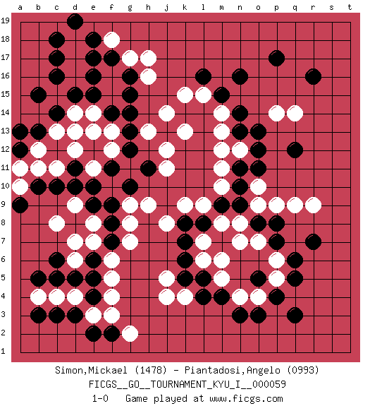 Last move : 1-0 2015 November 24 0:29:57 [Event "FICGS__GO__TOURNAMENT_KYU_I__000059"] [Site "FICGS"] [Date "2015.07.20"] [Round "1"] [Black "Simon,Mickael"] [White "Piantadosi,Angelo"] [Result "1-0"] [Rating 1 "1478"] [Rating 2 "0993"] 1.r16 d4 2.q3 d16 3.f17 h17 4.c17 d17 5.c16 c15 6.c18 d18 7.d15 d14 8.e15 e14 9.c14 f15 10.e16 f16 11.e17 g17 12.e18 f18 13.d19 k4 14.q5 q9 15.r7 r9 16.f14 f13 17.g14 c13 18.b15 d13 19.g16 h16 20.g15 j14 21.p17 q14 22.l16 k15 23.m15 m14 24.c6 c8 25.c3 c4 26.d3 e3 27.e2 f3 28.b3 b4 29.f2 g2 30.e4 f4 31.e5 f6 32.e6 e7 33.b5 d6 34.d5 d7 35.g13 f12 36.j13 k13 37.h11 j12 38.g12 h13 39.f7 f5 40.c5 g7 41.f8 g8 42.f9 g9 43.f11 e11 44.g10 h9 45.e12 e13 46.e10 d12 47.d11 c11 48.d10 j11 49.q12 p14 50.o12 o10 51.n14 m13 52.n13 n12 53.n11 m12 54.o11 m11 55.n10 o9 56.m9 n8 57.o13 l15 58.n16 m10 59.n9 m8 60.m4 m6 61.l5 l6 62.k5 j4 63.o8 p9 64.l8 n7 65.p7 o7 66.p8 p6 67.q6 p5 68.p4 o4 69.o3 n4 70.n3 m5 71.l4 j5 72.k6 l7 73.k7 l9 74.k8 k9 75.o5 j8 76.c10 e8 77.e9 d9 78.b10 b11 79.b13 b12 80.a12 a11 81.a13 a10 82.a9 1-0 Here are the names of the openings (joseki) played in the four corners : Corner d16 : d16 f17 Hoshi (Hwajeom, Seongjeom, Xingwei`) 4-4 Point. The star or hoshi (4-4) point, emphasizing influence at the potential expense of territory. Ikken Kakari (Hankan Keolch'im, Yi Gua`jiao~, 1-Space Low Approach). Black 2 is the standard approach move to the 4-4. Corner d4 : d4 c6 Hoshi (Hwajeom, Seongjeom, Xingwei`) 4-4 Point. The star or hoshi (4-4) point, emphasizing influence at the potential expense of territory. Ikken Kakari (Hankan Keolch'im, Yi Gua`jiao~, 1-Space Low Approach). Black 2 is the standard approach move to the 4-4. Player Black won this Go (weiqi, baduk) game. Follow this game move after move (download)Don't make dango's. (Anonymous) If you ain't just a little scared when you enter a casino, you are either very rich or you haven't studied the games enough. (Pappy)