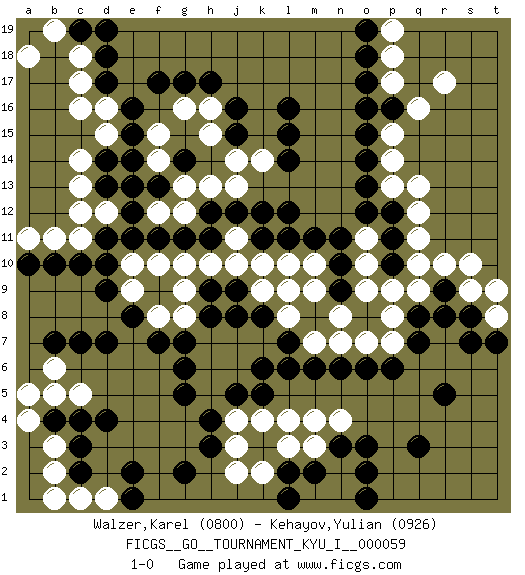 Last move : 1-0 2015 December 5 22:47:33 [Event "FICGS__GO__TOURNAMENT_KYU_I__000059"] [Site "FICGS"] [Date "2015.07.20"] [Round "1"] [Black "Walzer,Karel"] [White "Kehayov,Yulian"] [Result "1-0"] [Rating 1 "0800"] [Rating 2 "0926"] 1.d4 q16 2.q3 c16 3.r5 d12 4.e16 k4 5.h3 q10 6.d17 c17 7.h17 k10 8.d10 c11 9.c10 b11 10.b10 a11 11.o16 p17 12.o17 p18 13.d7 q13 14.q8 m4 15.n3 m3 16.l16 n4 17.o3 j4 18.h4 h5 19.g5 h6 20.g6 h7 21.k6 k7 22.l6 m7 23.l7 l8 24.k8 j7 25.m8 l9 26.m6 n7 27.n6 n8 28.o6 m9 29.k12 k14 30.l14 j14 31.l12 h13 32.g11 g13 33.d14 c14 34.e12 e13 35.d13 c13 36.d11 c12 37.e14 d15 38.e15 d16 39.d18 c18 40.f17 l4 41.j5 j6 42.k5 j2 43.j9 j3 44.g2 n2 45.o2 n1 46.l2 k2 47.m2 m1 48.l1 l3 49.o1 h10 50.h9 g9 51.g7 k9 52.j8 j10 53.h8 g10 54.f11 f10 55.h12 f12 56.f13 c5 57.c4 b5 58.a10 b3 59.b4 a4 60.c3 b2 61.c2 b1 62.b7 p8 63.q7 q9 64.o12 o11 65.p12 q12 66.p11 q11 67.n11 o10 68.p10 p9 69.n10 o9 70.j12 g12 71.h11 f14 72.e13 f15 73.j16 p14 74.o14 p15 75.o15 p13 76.o13 o7 77.o18 p19 78.r9 r10 79.s8 s10 80.o19 s9 81.r8 p7 82.p6 t8 83.t7 t9 84.s7 b6 85.c7 e10 86.e11 a5 87.e8 e9 88.d9 f8 89.f7 g8 90.c19 b19 91.d19 a18 92.p16 r17 93.l11 m10 94.m11 l10 95.k11 j11 96.n9 c1 97.e2 d1 98.e1 g16 99.g17 h16 100.j15 h15 101.l15 j13 102.g14 1-0 Here are the names of the openings (joseki) played in the four corners : Corner q16 : q16 o16 Hoshi (Hwajeom, Seongjeom, Xingwei`) 4-4 Point. The star or hoshi (4-4) point, emphasizing influence at the potential expense of territory. Ikken Takagakari (Hankan Nop'dakeolch'im, Yi Gaojia, 1-Space High Approach). White typically responds at 6-4 or 3-10. White 4-10 is played when White finds play on the right side advantageous. White 4-8 or 3-8 may be played when White has support at top. Player Black won this Go (weiqi, baduk) game. Follow this game move after move (download)Josekis are not fixed, definitive things. They indicate the moments when everything can change. (Pierre Audouard) Programmer - an organism that turns coffee into software. (Anonymous)