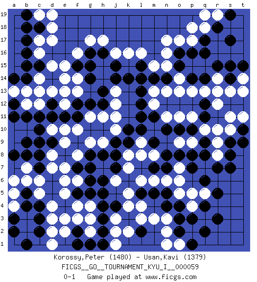 Last move : 0-1 2016 March 24 17:7:12 [Event "FICGS__GO__TOURNAMENT_KYU_I__000059"] [Site "FICGS"] [Date "2015.07.20"] [Round "1"] [Black "Korossy,Peter"] [White "Usan,Kavi"] [Result "0-1"] [Rating 1 "1480"] [Rating 2 "1379"] 1.q16 d4 2.q4 d17 3.c15 f16 4.b17 c12 5.c18 d18 6.c10 e12 7.c7 c5 8.e8 k4 9.k10 r10 10.r7 r13 11.r15 o17 12.o16 p17 13.q17 n16 14.o15 l16 15.q12 r12 16.q11 q10 17.o3 m3 18.h4 g4 19.h5 j3 20.h3 g3 21.h2 j2 22.l5 k5 23.g6 l6 24.m5 j6 25.f2 g2 26.g1 e3 27.c3 d2 28.b5 b6 29.b4 c6 30.c2 d3 31.a2 a5 32.b1 d7 33.c8 d8 34.d9 e7 35.g8 f8 36.f7 e9 37.b11 b12 38.b9 b7 39.b8 d10 40.d11 e10 41.d12 d13 42.c11 c13 43.e11 e14 44.f11 g9 45.h8 f6 46.g7 h9 47.j8 k7 48.k9 h11 49.f12 e13 50.h12 j11 51.g14 j12 52.h13 f13 53.g12 d15 54.k14 k16 55.j15 j16 56.m14 n15 57.n14 m6 58.n5 n6 59.p8 r8 60.p10 o9 61.q8 r9 62.s7 p9 63.q9 p11 64.o10 o11 65.n10 p13 66.f5 e6 67.g5 f3 68.n8 o7 69.o8 o5 70.n4 n3 71.o4 p5 72.r3 q5 73.r5 o14 74.l12 e5 75.s14 s13 76.s17 r14 77.s15 n13 78.l2 l3 79.j4 n2 80.o2 j1 81.h1 k2 82.b14 c17 83.b18 c16 84.b16 c14 85.b15 q18 86.r18 p18 87.h16 h17 88.g16 g17 89.t10 s10 90.t9 t11 91.s8 s11 92.q14 q13 93.p14 o13 94.p16 n11 95.m11 m12 96.l11 j13 97.j14 l8 98.m9 m8 99.p7 m13 100.l13 m15 101.l14 f10 102.n7 o6 103.m7 l4 104.q6 o1 105.p1 n1 106.q2 l9 107.l10 c19 108.b19 d19 109.j7 k8 110.j9 g11 111.f15 e15 112.a12 a13 113.a11 b13 114.a14 f14 115.g15 j10 116.h6 p4 117.p3 f4 118.l15 a4 119.a3 a6 120.c4 r19 121.s19 q19 122.a8 n17 123.c9 e2 124.f1 t14 125.t15 t13 126.s9 d1 0-1 Here are the names of the openings (joseki) played in the four corners : Corner d16 : d17 c15 Komoku (Somok, Xiao~mu`) 3-4 Point. The komoku (3-4) point is the traditional corner enclosure move.. Ikken Kakari (Hankan Keolch'im, Yi Gua`jiao~, 1-Space Low Pincer). The small knight move is the basic approach move to the 3-4 point stone. It has been continually used for over four centuries. There are limitless variations, with new moves constantly being discovered. Black 2 opens the door to a treaure store of joseki. Corner d4 : d4 c7 Hoshi (Hwajeom, Seongjeom, Xingwei`) 4-4 Point. The star or hoshi (4-4) point, emphasizing influence at the potential expense of territory. Niken Kakari (Dukan Keolch'im, E`r Gua`jiao~, 2-Space Low Approach). White typically answers by 7-3 or 3-5 (which is not joseki). Corner q16 : q16 r13 Hoshi (Hwajeom, Seongjeom, Xingwei`) 4-4 Point. The star or hoshi (4-4) point, emphasizing influence at the potential expense of territory. Niken Kakari (Dukan Keolch'im, E`r Gua`jiao~, 2-Space Low Approach). Black typically answers by 7-3 or 3-5 (which is not joseki). Player White won this Go (weiqi, baduk) game. Follow this game move after move (download)Don't make empty triangles. (Anonymous) When you've done things right people won't know you've done anything at all. (Futurama)