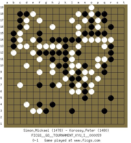 Last move : 0-1 2015 October 23 9:28:26 [Event "FICGS__GO__TOURNAMENT_KYU_I__000059"] [Site "FICGS"] [Date "2015.07.20"] [Round "1"] [Black "Simon,Mickael"] [White "Korossy,Peter"] [Result "0-1"] [Rating 1 "1478"] [Rating 2 "1480"] 1.r16 d4 2.q3 p17 3.q15 q13 4.q17 p16 5.q18 d16 6.r5 d10 7.f4 f3 8.g3 e3 9.h4 c7 10.l3 l17 11.c17 d17 12.c16 c15 13.b15 c14 14.b14 c13 15.d18 e18 16.c18 f17 17.r11 q11 18.q10 p11 19.r13 p10 20.q9 r14 21.r12 q14 22.p15 n14 23.o8 n9 24.l7 k8 25.p18 o18 26.h12 h10 27.h14 g13 28.k12 j13 29.l14 h13 30.n15 m15 31.m14 o14 32.o15 p14 33.k14 m16 34.j14 l12 35.o17 n17 36.n18 o19 37.o16 m18 38.k13 m13 39.j12 l10 40.f7 f9 41.b13 b12 42.h7 m7 43.m8 n8 44.n7 m6 45.l8 o7 46.n6 o6 47.n5 p8 48.k10 l9 49.m9 m10 50.n10 o9 51.j10 j7 52.f15 h16 53.f12 f13 54.e13 e14 55.f14 e12 56.g12 d13 57.h11 h9 58.k11 f11 59.k9 l6 60.m12 l11 0-1 Here are the names of the openings (joseki) played in the four corners : Corner q16 : r16 p17 Komoku (Somok, Xiao~mu`) 3-4 Point. The komoku (3-4) point is the traditional corner enclosure move.. Ikken Kakari (Hankan Keolch'im, Yi Gua`jiao~, 1-Space Low Pincer). The small knight move is the basic approach move to the 3-4 point stone. It has been continually used for over four centuries. There are limitless variations, with new moves constantly being discovered. White 2 opens the door to a treaure store of joseki. Corner d4 : d4 f4 Hoshi (Hwajeom, Seongjeom, Xingwei`) 4-4 Point. The star or hoshi (4-4) point, emphasizing influence at the potential expense of territory. Ikken Takagakari (Hankan Nop'dakeolch'im, Yi Gaojia, 1-Space High Approach). White typically responds at 6-4 or 3-10. White 4-10 is played when White finds play on the right side advantageous. White 4-8 or 3-8 may be played when White has support at top. Corner d16 : d16 c17 Hoshi (Hwajeom, Seongjeom, Xingwei`) 4-4 Point. The star or hoshi (4-4) point, emphasizing influence at the potential expense of territory. Player White won this Go (weiqi, baduk) game. Follow this game move after move (download)The simplest move is the best move. (Anonymous) I have opinions of my own - strong opinions - but I don't always agree with them. (George Bush)