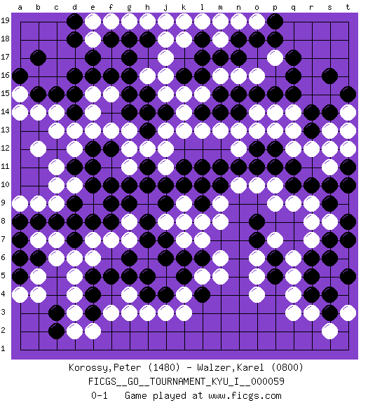 Last move : 0-1 2015 December 19 23:3:42 [Event "FICGS__GO__TOURNAMENT_KYU_I__000059"] [Site "FICGS"] [Date "2015.07.20"] [Round "1"] [Black "Korossy,Peter"] [White "Walzer,Karel"] [Result "0-1"] [Rating 1 "1480"] [Rating 2 "0800"] 1.q16 d4 2.d16 q4 3.k16 k4 4.r6 r8 5.p6 o4 6.s4 r3 7.r10 q9 8.q10 p9 9.r14 d10 10.k10 o6 11.s7 s8 12.s3 c14 13.d14 d13 14.c15 e14 15.d15 c13 16.g17 r7 17.s6 o16 18.m17 p17 19.q17 m16 20.n17 n16 21.l16 o14 22.o12 m13 23.m11 k13 24.g10 j15 25.l14 l13 26.m14 n13 27.n14 o13 28.o15 q13 29.p15 g12 30.j7 l7 31.o7 p7 32.p5 o5 33.o8 p10 34.p11 n10 35.n11 m9 36.h13 j11 37.k11 j13 38.h14 h12 39.r13 q12 40.q11 r12 41.f12 f13 42.e12 e13 43.e10 e9 44.f10 g13 45.d11 c11 46.d9 c10 47.e8 c9 48.d8 g3 49.g6 c7 50.e5 d5 51.c3 d3 52.c2 b4 53.e3 d2 54.j14 k14 55.h15 l15 56.n15 k15 57.m15 h16 58.g15 j17 59.g16 j16 60.l17 s2 61.r4 q3 62.t5 q5 63.r5 q6 64.h4 h3 65.j4 j3 66.e4 e2 67.k5 l5 68.l4 k3 69.l6 m5 70.k6 m6 71.b15 b14 72.l8 m8 73.l9 g4 74.g5 j5 75.h5 k7 76.j6 k8 77.j10 l10 78.l11 k9 79.j9 j8 80.h8 q14 81.q15 e6 82.f5 e15 83.e16 k18 84.p18 n19 85.m19 m18 86.n18 l19 87.o18 e18 88.d18 h19 89.f18 f19 90.e17 e19 91.d19 g19 92.h18 j18 93.m10 o10 94.p12 d12 95.e11 f7 96.f8 g7 97.h7 e7 98.c8 b7 99.b8 b9 100.a8 b12 101.h11 j12 102.b6 c6 103.a7 b5 104.a6 t3 105.t7 s13 106.s14 s11 107.s10 t14 108.t15 t13 109.s16 g8 110.g9 f15 111.f16 a15 112.a16 a14 113.b17 g11 114.h10 o19 115.p19 m19 116.l18 k19 117.t11 s12 118.t8 f3 119.d7 d6 120.a5 a4 121.s9 a9 122.f9 j19 123.g18 t12 124.t10 r9 125.g14 p13 126.l9 l8 127.l10 n12 128.o11 p14 0-1 Here are the names of the openings (joseki) played in the four corners : Corner q4 : q4 r6 Hoshi (Hwajeom, Seongjeom, Xingwei`) 4-4 Point. The star or hoshi (4-4) point, emphasizing influence at the potential expense of territory. Ikken Kakari (Hankan Keolch'im, Yi Gua`jiao~, 1-Space Low Approach). Black 2 is the standard approach move to the 4-4. Corner d16 : d16 c14 Hoshi (Hwajeom, Seongjeom, Xingwei`) 4-4 Point. The star or hoshi (4-4) point, emphasizing influence at the potential expense of territory. Ikken Kakari (Hankan Keolch'im, Yi Gua`jiao~, 1-Space Low Approach). White 2 is the standard approach move to the 4-4. Corner d4 : d4 j7 Hoshi (Hwajeom, Seongjeom, Xingwei`) 4-4 Point. The star or hoshi (4-4) point, emphasizing influence at the potential expense of territory. Player White won this Go (weiqi, baduk) game. Follow this game move after move (download)If White takes all four corners, Black should resign; if Black takes all four corners, Black should also resign. (David Kent) Depression is just anger without enthusiasm. (Unknown)