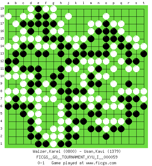 Last move : 0-1 2015 December 29 17:4:57 [Event "FICGS__GO__TOURNAMENT_KYU_I__000059"] [Site "FICGS"] [Date "2015.07.20"] [Round "1"] [Black "Walzer,Karel"] [White "Usan,Kavi"] [Result "0-1"] [Rating 1 "0800"] [Rating 2 "1379"] 1.d4 q16 2.q3 c16 3.r5 k3 4.m3 g3 5.d6 d10 6.e17 g16 7.g17 h17 8.f16 g18 9.f17 j18 10.c14 d15 11.g15 h16 12.d14 e15 13.f15 e14 14.c11 c10 15.d11 c7 16.c6 d7 17.e11 e7 18.c17 b17 19.d16 c15 20.o17 m17 21.n16 p17 22.q14 r15 23.r14 r11 24.r9 p11 25.o14 o18 26.e10 c18 27.d17 d18 28.h15 j15 29.h13 p9 30.n11 o12 31.n13 n12 32.m13 m12 33.l13 l12 34.j14 k15 35.k12 k11 36.j12 l10 37.m9 n10 38.e13 f14 39.f13 b14 40.c13 e3 41.d3 e4 42.k4 j4 43.l4 p6 44.q7 p7 45.m10 m11 46.n9 o10 47.n6 n7 48.l8 m6 49.n5 l7 50.k8 k7 51.j8 j11 52.g9 h9 53.h8 g8 54.f8 g7 55.h10 f9 56.g10 e8 57.d9 c9 58.e9 f7 59.h11 l9 60.j9 m8 61.j6 h6 62.j5 h5 63.j7 p4 64.p3 q4 65.r4 o4 66.n3 n4 67.m5 m16 68.o15 n17 69.o16 p13 70.q15 s15 71.k6 o6 72.l6 m7 73.j3 h4 74.j2 q8 75.r7 r8 76.s7 s8 77.b13 g14 78.h14 b15 79.p16 q17 80.e2 f2 81.d2 e6 82.b7 b8 83.b6 h2 84.k2 b11 85.r12 q12 86.s12 s11 87.m15 l15 88.l14 d5 89.c5 e5 90.b12 b10 91.d8 c8 92.f18 p14 93.p15 s14 94.r13 t7 95.t6 t8 96.s5 q6 97.r6 o3 98.o2 f19 99.e19 g19 100.e18 a18 101.h1 g1 102.j1 h3 103.e1 d19 104.f1 g2 105.t13 t14 106.o13 k14 107.k13 a7 108.a6 a8 109.a11 a10 110.a12 a14 0-1 Here are the names of the openings (joseki) played in the four corners : Corner d4 : d4 g3 Hoshi (Hwajeom, Seongjeom, Xingwei`) 4-4 Point. The star or hoshi (4-4) point, emphasizing influence at the potential expense of territory. Niken Kakari (Dukan Keolch'im, E`r Gua`jiao~, 2-Space Low Approach). Black typically answers by 7-3 or 3-5 (which is not joseki). Corner d16 : c16 e17 Komoku (Somok, Xiao~mu`) 3-4 Point. The komoku (3-4) point is the traditional corner enclosure move.. Ikken Kakari (Hankan Keolch'im, Yi Gua`jiao~, 1-Space Low Pincer). The small knight move is the basic approach move to the 3-4 point stone. It has been continually used for over four centuries. There are limitless variations, with new moves constantly being discovered. Black 2 opens the door to a treaure store of joseki. Corner q16 : q16 o17 Hoshi (Hwajeom, Seongjeom, Xingwei`) 4-4 Point. The star or hoshi (4-4) point, emphasizing influence at the potential expense of territory. Ikken Kakari (Hankan Keolch'im, Yi Gua`jiao~, 1-Space Low Approach). Black 2 is the standard approach move to the 4-4. Player White won this Go (weiqi, baduk) game. Follow this game move after move (download)For rectangular six in the corner, dame is necessary. (Anonymous) He who fights with monsters should be careful lest he thereby become a monster. (Friedrich Nietzsche, Beyond Good and Evil)