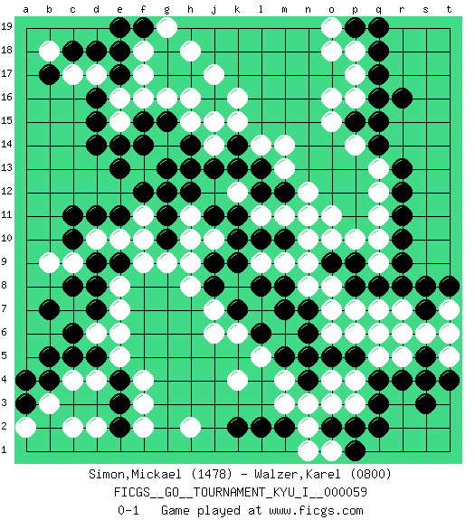 Last move : 0-1 2015 September 26 13:30:36 [Event "FICGS__GO__TOURNAMENT_KYU_I__000059 "] [Site "FICGS"] [Date "2015.07.20"] [Round "1"] [Black "Simon,Mickael "] [White "Walzer,Karel "] [Result "0-1"] [Rating 1 "1478"] [Rating 2 "0800"] 1.r16 p17 2.q15 o15 3.r10 k16 4.q3 d4 5.d16 f16 6.d14 k4 7.c6 d6 8.d7 e6 9.c5 c4 10.c10 r5 11.q8 p4 12.q4 q5 13.p5 p6 14.o5 p3 15.p2 o3 16.o2 n3 17.s3 p7 18.m5 m4 19.n7 o8 20.l8 j7 21.m10 n8 22.m7 o10 23.j9 q11 24.r11 q12 25.r12 p14 26.q14 q13 27.r13 m11 28.l10 l11 29.k11 k12 30.j11 e7 31.d8 h9 32.m2 l5 33.e17 f17 34.n4 m3 35.l6 k6 36.j8 h8 37.k7 j6 38.q17 o16 39.k2 n2 40.l2 o1 41.q2 h2 42.e18 f18 43.f14 f10 44.h14 h15 45.k14 l14 46.d5 e5 47.e4 f4 48.e3 f3 49.e2 c2 50.b4 b3 51.b5 f2 52.j15 h16 53.j16 j17 54.l13 k15 55.k13 m14 56.n11 n12 57.m12 m13 58.l12 o11 59.e11 g12 60.q18 p18 61.p19 o19 62.q19 o18 63.f19 g19 64.e19 h18 65.a3 a2 66.a4 d2 67.s7 r7 68.r8 q7 69.t6 s6 70.s8 j14 71.h13 f13 72.e13 h11 73.h12 h10 74.f12 f11 75.g13 e10 76.d11 o6 77.n6 t5 78.s4 t7 79.s5 n10 80.r6 q6 81.r4 e15 82.d15 e8 83.d9 m9 84.p9 q10 85.o9 n9 86.t8 t6 87.p8 o7 88.j13 j15 89.g15 g16 90.f15 e16 91.t4 d17 92.d18 c17 93.c18 b18 94.b17 r6 95.p1 n1 96.g11 l9 97.k9 j10 98.k10 m11 99.g10 g9 100.g12 q9 101.e9 f9 102.r9 p10 103.m8 p16 104.q16 o4 105.n5 d10 106.e14 c7 107.b7 c9 108.c8 b9 109.c11 n11 110.p15 l11 111.pass pass 0-1 Here are the names of the openings (joseki) played in the four corners : Corner q16 : r16 p17Komoku (Somok, Xiao~mu`) 3-4 Point. The komoku (3-4) point is the traditional corner enclosure move..Ikken Kakari (Hankan Keolch'im, Yi Gua`jiao~, 1-Space Low Pincer). The small knight move is the basic approach move to the 3-4 point stone. It has been continually used for over four centuries. There are limitless variations, with new moves constantly being discovered. White 2 opens the door to a treaure store of joseki. Corner d16 : d16 f16Hoshi (Hwajeom, Seongjeom, Xingwei`) 4-4 Point. The star or hoshi (4-4) point, emphasizing influence at the potential expense of territory.Ikken Takagakari (Hankan Nop'dakeolch'im, Yi Gaojia, 1-Space High Approach). Black typically responds at 6-4 or 3-10. Black 4-10 is played when Black finds play on the right side advantageous. Black 4-8 or 3-8 may be played when Black has support at top. Corner d4 : d4 c6Hoshi (Hwajeom, Seongjeom, Xingwei`) 4-4 Point. The star or hoshi (4-4) point, emphasizing influence at the potential expense of territory.Ikken Kakari (Hankan Keolch'im, Yi Gua`jiao~, 1-Space Low Approach). Black 2 is the standard approach move to the 4-4. Corner q4 : q3 r5Komoku (Somok, Xiao~mu`) 3-4 Point. The komoku (3-4) point is the traditional corner enclosure move..Ikken Kakari (Hankan Keolch'im, Yi Gua`jiao~, 1-Space Low Pincer). The small knight move is the basic approach move to the 3-4 point stone. It has been continually used for over four centuries. There are limitless variations, with new moves constantly being discovered. White 2 opens the door to a treaure store of joseki. Player White won this Go (weiqi, baduk) game.Follow this game move after move (download ) When you study joseki, you lose two stones in strength. (Anonymous) A good player is always lucky. (Capablanca)