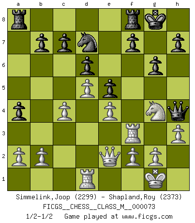 Last move : 1/2-1/2 2015 November 3 13:48:46 [Event "FICGS__CHESS__CLASS_M__000073"] [Site "FICGS"] [Date "2015.07.21"] [Round "1"] [White "Simmelink,Joop"] [Black "Shapland,Roy"] [Result "1/2-1/2"] [WhiteElo "2299"] [BlackElo "2373"] 1.e4 e5 2.Nf3 Nc6 3.Bc4 Bc5 4.c3 Nf6 5.d3 O-O 6.Nbd2 d6 7.O-O a5 8.Re1 a4 9.Bb5 Bd7 10.Nf1 Ng4 11.Be3 Nxe3 12.Nxe3 Bxe3 13.Rxe3 Nb8 14.Bxd7 Nxd7 15.Qe2 Re8 16.Rd1 Qe7 17.d4 Nf6 18.h3 g6 19.Nh2 Ra5 20.d5 Nd7 21.c4 R5a8 22.Ng4 Rf8 23.Rf3 Qh4 1/2-1/2 Giuoco Piano Kingside Castling by player Black (move 5) Kingside Castling by player White (move 7) This chess game ended in a draw. Follow this game move after move (download)Becoming successful at Chess allows you to discover your own personality. That's what I want for the kids I teach. (Saudin Robovic) Rubinstein ist ein Turmendspiel, welches die Götter vor tausenden von Jahren begannen. (Savielly Grigorievitsch Tartakower) No hay un Gran Maestro de Ajedrez que sea normal; solo se diferencían ellos por la magnitud de su locura. (Viktor Korchnoi) Botvinnik disait en comparant les échecs à la musique: Il existe une science dont le but est l'étude de l'acoustique et des sons. Mais il y a aussi un art qui se sert de l'océan des sons : c'est la musique. De toute évidence, il en est de même pour la pensée. La logique est l'étude des lois de la réflexion et les échecs reflètent, en tant qu'art, le côté logique de la réflexion, sous la forme d'images artistiques... Extrait de Fischer - Spassky, Reykjavik 1972 par Alexander & F. Wyndham (Ed. Solar), p 37. Imagination is more important than knowledge. Knowledge is limited. Imagination encircles the world. (Albert Einstein)