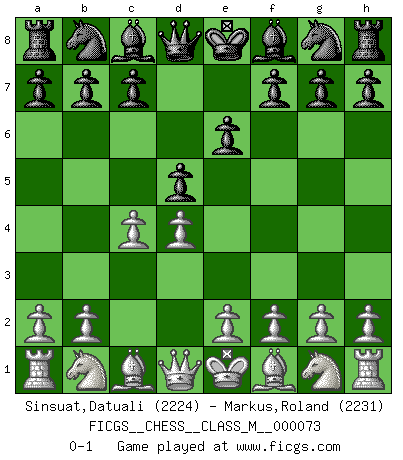 Last move : 0-1 2015 September 13 10:56:12 [Event "FICGS__CHESS__CLASS_M__000073"] [Site "FICGS"] [Date "2015.07.21"] [Round "1"] [White "Sinsuat,Datuali"] [Black "Markus,Roland"] [Result "0-1"] [WhiteElo "2224"] [BlackElo "2231"] 1.d4 d5 2.c4 e6 0-1 This chess game has been lost on time (started : 2015.07.21 0:26:1) Queen's gambit declined Player Black won this chess game. Follow this game move after move (download)All my games are real. (Bobby Fischer) Ein Springer auf f6 gegen die eigene Rochadestellung ist schlimmer als ein rostiger Nagel im Knie. (Efim Bogoljubov) El Ajedrez es una guerra en un tablero. El objetivo es aplastar la mente del oponente. (Bobby Fischer) A chaque perte on perd un peu de soi. (Joël Lautier) To err is human, to shift the blame on someone else is tactical. (Mladen Jankovic)