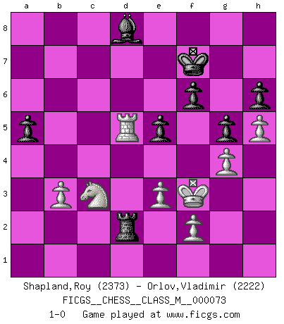 Last move : 1-0 2016 January 26 11:21:57 [Event "FICGS__CHESS__CLASS_M__000073"] [Site "FICGS"] [Date "2015.07.21"] [Round "1"] [White "Shapland,Roy"] [Black "Orlov,Vladimir"] [Result "1-0"] [WhiteElo "2373"] [BlackElo "2222"] 1.d4 Nf6 2.c4 e6 3.Nf3 b6 4.g3 Ba6 5.b3 Bb4+ 6.Bd2 Be7 7.Bg2 O-O 8.O-O d5 9.Ne5 Bb7 10.Nc3 Nbd7 11.Bf4 c5 12.Rc1 Rc8 13.dxc5 Nxe5 14.Bxe5 Bxc5 15.Bxf6 Qxf6 16.cxd5 Qe5 17.Qd3 Rfd8 18.Rfd1 Bb4 19.Nb5 Rxc1 20.Rxc1 a6 21.Qd4 Qxd4 22.Nxd4 Bxd5 23.Bxd5 Rxd5 24.Rc8+ Bf8 25.e3 g5 26.Ra8 a5 27.Rb8 Rd6 28.Nf3 f6 29.g4 e5 30.Kg2 Kf7 31.h4 h6 32.h5 Rc6 33.Nd2 Bd6 34.Ra8 Rc2 35.Ne4 Be7 36.Ra6 Rxa2 37.Rxb6 Rb2 38.Rb5 Ke6 39.Kg3 Kf7 40.Kf3 Bb4 41.Rb7+ Be7 42.Nc3 Rd2 43.Rb5 Bd8 44.Rd5 1-0 Queen's Indian : Nimzovich variation (exaggerated Fianchetto) Kingside Castling by player Black (move 7) Kingside Castling by player White (move 8) Player White won this chess game. Follow this game move after move (download)Chess is ruthless: you've got to be prepared to kill people. (Nigel Short) Jeder leidlich begabte Spieler, er braucht keineswegs hervorragend veranlagt zu sein, kann es zum Meister bringen. Aber das ist ja auch gar nicht nötig! Der richtige Standpunkt ist es, zu seinem Vergnügen zu spielen, und man glaube ja nicht, dass der Genuss proportional dem Können sei. (Siegbert Tarrasch) Coloca el contenido de las piezas del Ajedrez en un sombrero, agitalo vigorosamente, arrojalas en un tablero desde una altura de 30 centimetros y así obtendras el estilo de Steinitz. (H. E. Bird) Vous m'avez demandé de vous exposer quel est le fondement de la prière. Je ne fais que préparer les pièces du jeu sur la table... Nous sera-t-il permis d'en adopter les règles et si nous les appliquons scrupuleusement nous ne tarderons pas à faire mat le Roi divin ! Il ne pourra échapper à nos mains. (Sainte Thérèse d'Avila, Chemin de perfection) Think like a man of action, act like a man of thought. (Henri Louis Bergson)