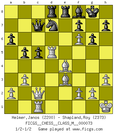 Last move : 1/2-1/2 2015 December 20 16:19:49 [Event "FICGS__CHESS__CLASS_M__000073"] [Site "FICGS"] [Date "2015.07.21"] [Round "1"] [White "Helmer,Janos"] [Black "Shapland,Roy"] [Result "1/2-1/2"] [WhiteElo "2200"] [BlackElo "2373"] 1.Nf3 Nf6 2.c4 e6 3.Nc3 d5 4.d4 c6 5.e3 Nbd7 6.Qc2 Bd6 7.Bd3 O-O 8.O-O dxc4 9.Bxc4 b5 10.Be2 a6 11.e4 e5 12.h3 Re8 13.Be3 exd4 14.Nxd4 Qc7 15.Rac1 g6 16.Rfd1 Bh2+ 17.Kh1 c5 18.Nc6 Bd6 19.Bf3 Bf8 20.e5 Bb7 21.exf6 Bxc6 22.Nd5 Bxd5 23.Rxd5 Rad8 24.b3 Ne5 25.Be4 Nd7 1/2-1/2 Reti Opening Kingside Castling by player Black (move 7) Kingside Castling by player White (move 8) This chess game ended in a draw. Follow this game move after move (download)My style is somewhere between that of Tal and Petrosian. (Reshevsky) Schach ist ein schwarz-weisser Dschungel. (Garry Kasparov) Peones: ellos son el alma de esta partida, solos forman el ataque y la defensa. (Philidor) RxDa4 pat (...) Yoga is 99% practice and 1% knowledge. (Sri Krishna Pattabhi Jois)