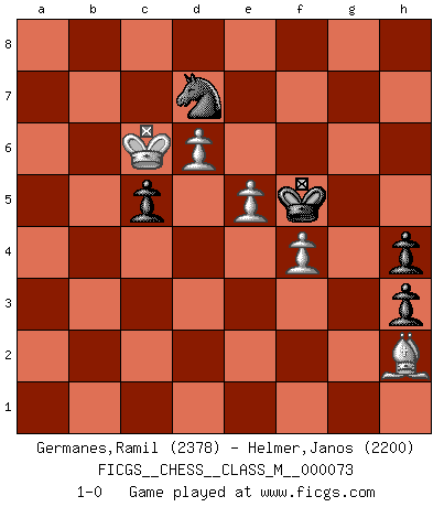 Last move : 1-0 2016 June 10 2:31:33 [Event "FICGS__CHESS__CLASS_M__000073"] [Site "FICGS"] [Date "2015.07.21"] [Round "1"] [White "Germanes,Ramil"] [Black "Helmer,Janos"] [Result "1-0"] [WhiteElo "2378"] [BlackElo "2200"] 1.d4 Nf6 2.c4 g6 3.Nc3 Bg7 4.e4 d6 5.Nf3 O-O 6.Be2 e5 7.d5 a5 8.Bg5 h6 9.Be3 Ng4 10.Bc1 Na6 11.O-O Bd7 12.Ne1 f5 13.f3 Nf6 14.Nd3 f4 15.Bd2 b6 16.a3 Nc5 17.Nxc5 bxc5 18.b4 axb4 19.axb4 cxb4 20.Nb5 Qb8 21.Bxb4 Rxa1 22.Qxa1 Qb7 23.Qb2 Ra8 24.Ra1 Ne8 25.Rxa8 Qxa8 26.Kf1 Qa6 27.Qa3 Qxa3 28.Bxa3 Kf7 29.Na7 Bf8 30.Bb2 Bg7 31.c5 dxc5 32.Bb5 Bxb5+ 33.Nxb5 h5 34.Bc3 g5 35.Na7 Nd6 36.Ba5 Nc4 37.Bxc7 Ne3+ 38.Kf2 Nd1+ 39.Ke2 Ne3 40.Nc6 Nxg2 41.h3 Ne3 42.Nxe5+ Bxe5 43.Bxe5 Ke7 44.Bc7 Nc4 45.h4 gxh4 46.Bxf4 h3 47.e5 Nb6 48.d6+ Ke6 49.Bh2 Nd7 50.f4 Kf5 51.Kd2 Nb6 52.Kd3 h4 53.Kd2 Nc4+ 54.Kc3 Nb6 55.Kd3 Nd7 56.Kc4 Ke6 57.Bg1 Kf5 58.Kd5 Nf8 59.Bh2 Nd7 60.Kc6 1-0 King's Indian : Petrosian system, Stein variation Kingside Castling by player Black (move 5) Kingside Castling by player White (move 11) 10 pieces endgame at move 46 : White KBPPP , Black KNPPP WHITE : King + 1 Bishop 3 Pawns BLACK : King + 1 Knight 3 Pawns Player White won this chess game. Follow this game move after move (download)The Chess pieces are the block alphabet which shapes thoughts; and these thoughts, although making a visual design on the chessboard, express their beauty abstractly, like a poem. (Marcel Duchamp) Ich moechte nie einem Club beitreten, der Leute wie mich als Mitglieder aufnimmt. (Woody Allen) Nada excita más a Grandes Maestros aburridos que una novedad teórica. (Dominic Lawson) Les échecs, c'est la lutte contre l'erreur. (Johannes Zukertort) Life is like internet, nothing interesting, but noone want to leave it. (Ilmars Cirulis)