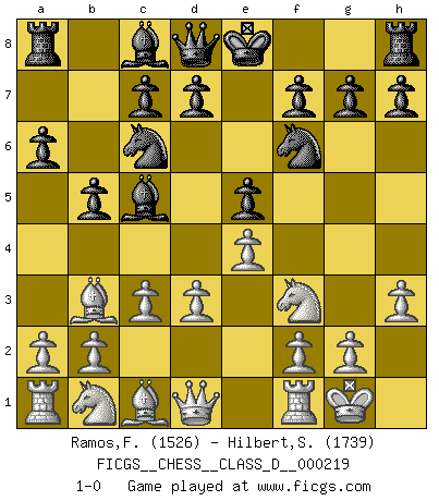 Last move : 1-0 2015 September 26 11:30:8 [Event "FICGS__CHESS__CLASS_D__000219"] [Site "FICGS"] [Date "2015.07.21"] [Round "1"] [White "Ramos,Francis"] [Black "Hilbert,Stephan J."] [Result "1-0"] [WhiteElo "1526"] [BlackElo "1739"] 1.e4 e5 2.Nf3 Nc6 3.Bb5 a6 4.Ba4 b5 5.Bb3 Nh6 6.d3 Ng4 7.h3 Nf6 8.O-O Bc5 9.c3 1-0 This chess game has been lost on time (started : 2015.07.21 17:16:23) Ruy Lopez : Caro variation Kingside Castling by player White (move 8) Player White won this chess game. Follow this game move after move (download)Every Pawn is a potential Queen. (James Mason) Gewinnen beim Schach fördert das Selbstvertrauen. Beim Sex spüre ich sowas nicht... (Garry Kasparov) a manera como él juega al Ajedrez, demuestra la completa naturaleza de un hombre. (Stanley Ellin) La vérité est comme le meilleur coup aux échecs : elle existe, mais il faut la chercher. (Arturo Perez-Reverte) I live to kill Traxler counterattack. (Ilmars Cirulis)