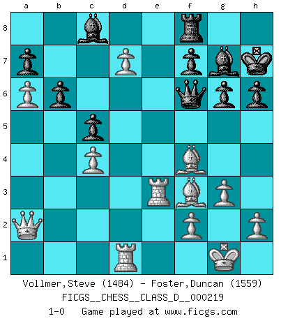 Last move : 1-0 2015 July 27 1:5:20 [Event "FICGS__CHESS__CLASS_D__000219"] [Site "FICGS"] [Date "2015.07.21"] [Round "1"] [White "Vollmer,Steve"] [Black "Foster,Duncan"] [Result "1-0"] [WhiteElo "1484"] [BlackElo "1559"] 1.c4 b6 2.d4 Bb7 3.Nc3 e6 4.e4 g6 5.Nf3 h6 6.Bd3 Bg7 7.O-O Ne7 8.Be3 O-O 9.Qd2 Kh7 10.a4 d5 11.a5 Ba6 12.b3 dxc4 13.bxc4 Qc8 14.Rfd1 Nd7 15.Ra3 c5 16.d5 exd5 17.Nxd5 Nxd5 18.exd5 Bb7 19.Qa2 Qc7 20.a6 Bc8 21.Be4 Qd6 22.g3 Nf6 23.Bf4 Qd7 24.Ne5 Qe7 25.d6 Qe6 26.Bxa8 Ng4 27.Nxg4 Qxg4 28.Bf3 Qe6 29.Re3 Qf6 30.d7 1-0 English Opening Kingside Castling by player White (move 7) Kingside Castling by player Black (move 8) Player White won this chess game. Follow this game move after move (download)By this measure (on the gap between Fischer & his contemporaries), I consider him the greatest world champion. (Garry Kasparov) Wer mein Gambit spielt, muß bereit sein, alle Brücken hinter sich abzubrechen. Es verändert den ganzen Menschen. Es wirkt wie ein Zauberstab und fördert verkümmerte, gute Charakter- eigenschaften wieder zu Tage. (Emil Joseph Diemer) Realmente no sabemos como el juego fue inventado, aunque hay sospechas. Tan pronto como descubramos a los culpables, se los haremos saber. (Bruce Pandolfini) En blitz, le Cavalier l'emporte sur le Fou. (Vlastimil Hort) Pushing plastic is for the many, pushing virtual pieces is for the fewer, pushing wood is for the very few. (Normajean Yates)