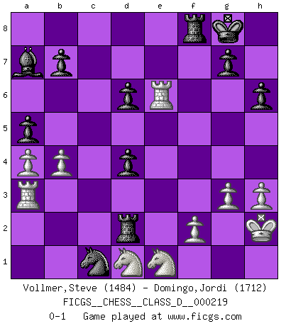 Last move : 0-1 2015 August 14 22:32:39 [Event "FICGS__CHESS__CLASS_D__000219"] [Site "FICGS"] [Date "2015.07.21"] [Round "1"] [White "Vollmer,Steve"] [Black "Domingo,Jordi"] [Result "0-1"] [WhiteElo "1484"] [BlackElo "1712"] 1.Nf3 h6 2.e4 c5 3.d4 cxd4 4.Nxd4 a6 5.Nc3 e5 6.Nf3 Nc6 7.Bc4 Nf6 8.O-O Bc5 9.a4 d6 10.h3 Be6 11.Bxe6 fxe6 12.Qe2 O-O 13.Be3 Nd4 14.Bxd4 exd4 15.Nd1 Nh5 16.b4 Nf4 17.Qc4 Ba7 18.Ra3 Qf6 19.Kh2 Qg6 20.g3 Rac8 21.Qb3 Ne2 22.Qd3 Nc1 23.Qd2 Qxe4 24.Re1 Qxc2 25.Qxc2 Rxc2 26.Rxe6 a5 27.Ne1 Rd2 0-1 Reti Opening Kingside Castling by player White (move 8) Kingside Castling by player Black (move 12) Player Black won this chess game. Follow this game move after move (download)You may learn much more from a game you lose than from a game you win. You will have to lose hundreds of games before becoming a good player. (Jose Raul Capablanca) Im Schach gewinnt jeder. Hat man Freunde am Spiel - und das ist die Hauptsache - ist auch der Verlust einer Partie kein Unglück. (David Bronstein) ¿Esta Bobby Fischer algo cuerdo?. (Salo Flohr) Le succès, c'est être capable d'aller d'échec en échec sans perdre son enthousiasme. (Winston Churchill) The problem with manipulation is that people can turn on you. (Horatio Caine, C.S.I. Miami)
