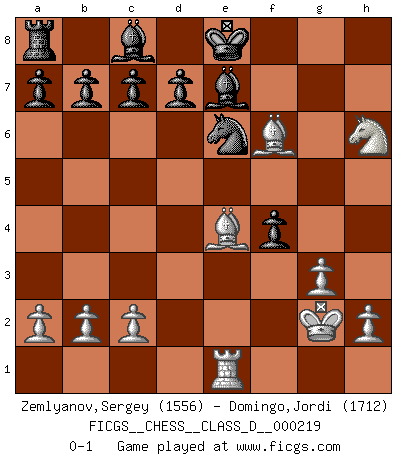 Last move : 0-1 2016 June 7 10:10:19 [Event "FICGS__CHESS__CLASS_D__000219"] [Site "FICGS"] [Date "2015.07.21"] [Round "1"] [White "Zemlyanov,Sergey"] [Black "Domingo,Jordi"] [Result "0-1"] [WhiteElo "1556"] [BlackElo "1712"] 1.e4 e5 2.Nf3 f5 3.Nxe5 Qf6 4.Nc4 fxe4 5.Nc3 Qe6 6.Ne3 Nf6 7.Bc4 Qe5 8.d4 exd3 9.O-O Bd6 10.g3 Nc6 11.Re1 Kd8 12.Bxd3 Re8 13.Bd2 Nd4 14.Ng2 Qh5 15.Rxe8+ Kxe8 16.Qxh5+ Nxh5 17.Nh4 Nf6 18.Re1+ Kd8 19.Ne4 Nxe4 20.Bxe4 h6 21.Bc3 Ne6 22.f4 g5 23.Nf5 Bc5+ 24.Kg2 gxf4 25.Bf6+ Ke8 26.Nxh6 Be7 0-1 This chess game has been lost on time (started : 2015.07.21 17:16:23) Latvian counter-gambit Kingside Castling by player White (move 9) Player Black won this chess game. Follow this game move after move (download)It's just you and your opponent at the board and you're trying to prove something. (Bobby Fischer) Korrekt heißt in Deutschland die Haltung eines Mannes, dessen Benehmen nach dem Urteile seiner Nachbarn seiner Stellung angemessen ist. Um korrekt zu sein, muß man sich der Meinung der anderen anpassen... (Emanuel Lasker) El Ajedrez es una guerra en un tablero. El objetivo es aplastar la mente del oponente. (Bobby Fischer) Le moment que je préfère le plus dans une rencontre, c'est celui où je sens que la personnalité de l'adversaire se brise. (Robert Fischer) I fear not the man who has practiced 10,000 kicks once, but I fear the man who has practiced one kick 10,000 times. (Bruce Lee)