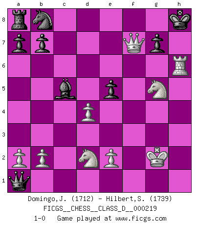 Last move : 1-0 2015 November 4 12:12:13 [Event "FICGS__CHESS__CLASS_D__000219"] [Site "FICGS"] [Date "2015.07.21"] [Round "1"] [White "Domingo,Jordi"] [Black "Hilbert,Stephan J."] [Result "1-0"] [WhiteElo "1712"] [BlackElo "1739"] 1.g4 d5 2.Bg2 e5 3.c4 c6 4.cxd5 cxd5 5.Qb3 Nf6 6.g5 Ng4 7.h3 Nxf2 8.Kxf2 Qxg5 9.Bxd5 Qf4+ 10.Nf3 Bc5+ 11.Kg2 O-O 12.d4 Bxh3+ 13.Rxh3 Qxc1 14.Nbd2 Qxa1 15.Bxf7+ Rxf7 16.Ng5 h6 17.Qxf7+ Kh8 18.Rxh6+ 1-0 Grob's attack Kingside Castling by player Black (move 11) Player White won this chess game. Follow this game move after move (download)Chess is the art of analysis. (Mikhail Botvinnik) Frage des Reporters: -Welche besonderen Umstände rechtfertigen das Anhalten der Uhren während einer Turnierpartie? Antwort: -Einen Fotographen zu strangulieren. (Siegbert Tarrasch) Cada Peón es una Reina en potencia. (James Mason) La tactique, c'est ce que vous faites quand il y a quelque chose à faire; la stratégie, c'est ce que vous faites quand il n'y a rien à faire. (Savielli Tartacower) The Movers & Shakers of this world are those who play chess in the mornings and go to the disco in the evenings. (Dinesh De Silva)
