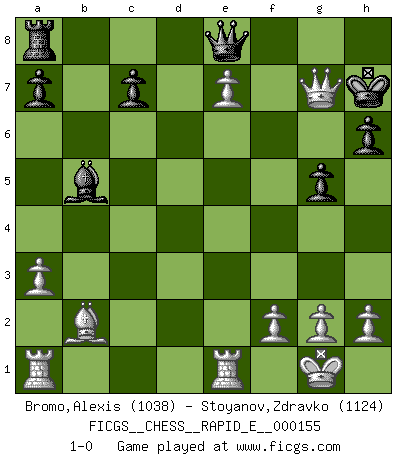 Last move : 1-0 2015 July 29 6:7:5 [Event "FICGS__CHESS__RAPID_E__000155"] [Site "FICGS"] [Date "2015.07.22"] [Round "1"] [White "Bromo,Alexis"] [Black "Stoyanov,Zdravko"] [Result "1-0"] [WhiteElo "1038"] [BlackElo "1124"] 1.d4 d5 2.c4 dxc4 3.Nc3 Bd7 4.e4 h6 5.Bxc4 e6 6.Nf3 Nc6 7.a3 Be7 8.O-O Na5 9.Ba2 Nf6 10.Re1 O-O 11.b4 Nc6 12.Bb2 Nh5 13.d5 exd5 14.exd5 Nb8 15.Ne5 Nf6 16.Ng6 fxg6 17.d6 Rf7 18.Bxf7+ Kxf7 19.dxe7 Qe8 20.Nd5 Na6 21.Nxf6 gxf6 22.Qd5+ Kg7 23.Qxb7 Bc6 24.Qxa6 g5 25.b5 Bxb5 26.Qxf6+ Kh7 27.Qg7+ 1-0 Queen's gambit accepted Kingside Castling by player White (move 8) Kingside Castling by player Black (move 10) Player White won this chess game. Follow this game move after move (download)Chess is a sea in which a gnat may drink and an elephant may bathe. (Hindu proverb) Über Frauen: Chess is better. (Robert James Fischer) Un entendimiento a fondo de las continuaciones típicas del mate, hace de las combinaciones de sacrificio mas complicadas conducirlas a ellas no solo sin dificultad, sino casi de una manera natural. (Siegbert Tarrasch) Un footballeur joue avec ses pieds, parfois avec sa tête. Un joueur d'échecs ne joue qu'avec sa tête. Et quand il ne joue plus, il meurt. (Jacob Murray) What doesn't kill us makes us stronger. (Friedrich Nietzsche)