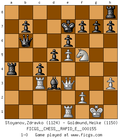 Last move : 1-0 2015 September 6 22:38:34 [Event "FICGS__CHESS__RAPID_E__000155"] [Site "FICGS"] [Date "2015.07.22"] [Round "1"] [White "Stoyanov,Zdravko"] [Black "Goldmund,Heike"] [Result "1-0"] [WhiteElo "1124"] [BlackElo "1150"] 1.e4 d5 2.e5 Bf5 3.h3 e6 4.Nf3 c5 5.c3 Nc6 6.d4 Qb6 7.b3 Bg6 8.Ng5 Nge7 9.Qf3 Nf5 10.g4 Nh4 11.Qg3 Nf5 12.gxf5 Bxf5 13.Be3 Be7 14.a4 Qxb3 15.Nd2 Qxc3 16.Rd1 Nxd4 17.Bxd4 Qxd4 18.Bb5+ Kf8 19.Ngf3 Qb4 20.O-O a6 21.Rb1 Qa5 22.Nb3 Qc7 23.Rbc1 c4 24.Nfd4 Bd3 25.Rfe1 axb5 26.Nxb5 Qb6 27.N3d4 Rxa4 28.Qe3 Bb4 29.Nc3 Bxc3 30.Rxc3 Ke7 31.Nf5+ 1-0 Scandinavian (centre counter) defense Kingside Castling by player White (move 20) Player White won this chess game. Follow this game move after move (download)Kasparov : J'adoube , Ivanchuk : S'il vous plaît ! (Garry Kasparov & Vassily Ivanchuk, Linares 1997) Bobby Fischer ist kein Vorbild für die heutige Jugend. (Viktor Kortschnoi) Robert Fischer es la ley hacia si mismo. (Larry Evans) Botvinnik disait en comparant les échecs à la musique: Il existe une science dont le but est l'étude de l'acoustique et des sons. Mais il y a aussi un art qui se sert de l'océan des sons : c'est la musique. De toute évidence, il en est de même pour la pensée. La logique est l'étude des lois de la réflexion et les échecs reflètent, en tant qu'art, le côté logique de la réflexion, sous la forme d'images artistiques... Extrait de Fischer - Spassky, Reykjavik 1972 par Alexander & F. Wyndham (Ed. Solar), p 37. Programmer - an organism that turns coffee into software. (Anonymous)