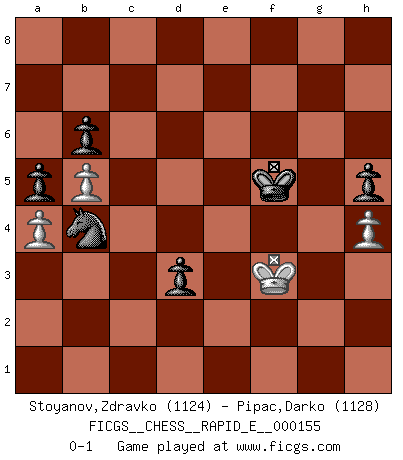 Last move : 0-1 2015 September 8 11:29:29 [Event "FICGS__CHESS__RAPID_E__000155"] [Site "FICGS"] [Date "2015.07.22"] [Round "1"] [White "Stoyanov,Zdravko"] [Black "Pipac,Darko"] [Result "0-1"] [WhiteElo "1124"] [BlackElo "1128"] 1.e4 e5 2.Nf3 d6 3.h3 Nf6 4.c3 Nxe4 5.Qa4+ Nc6 6.Qxe4 g6 7.Bb5 Bd7 8.O-O a6 9.Bc4 Bg7 10.Ng5 Qxg5 11.Qf3 Qf5 12.Qxf5 Bxf5 13.d3 O-O-O 14.Bxf7 Bxd3 15.Rd1 Bc2 16.Re1 Bxb1 17.Rxb1 Rhf8 18.Bd5 Ne7 19.Bg5 Bf6 20.Bh6 Rh8 21.Re4 Nxd5 22.Rd1 Ne7 23.b4 c6 24.Be3 d5 25.Rg4 d4 26.cxd4 exd4 27.Bxd4 Bxd4 28.Rgxd4 Rxd4 29.Rxd4 Nf5 30.Re4 Rd8 31.a4 Kc7 32.g4 Nd4 33.Re7+ Rd7 34.Re4 Nf3+ 35.Kg2 Ng5 36.Re5 Nf7 37.Re3 Kb6 38.Rf3 Ne5 39.Rc3 a5 40.Rc5 Rd5 41.Rxd5 cxd5 42.b5 Kc5 43.f4 Nd3 44.f5 gxf5 45.gxf5 Kd6 46.Kg3 Ke7 47.h4 h5 48.Kf3 Kf6 49.Ke3 Nb4 50.Kf4 d4 51.Ke4 d3 52.Ke3 Kxf5 53.Kf3 b6 0-1 Philidor's defense Kingside Castling by player White (move 8) Queenside Castling by player Black (move 13) 10 pieces endgame at move 52 : White KPPP , Black KNPPPP WHITE : King + 3 Pawns BLACK : King + 1 Knight 4 Pawns Player Black won this chess game. Follow this game move after move (download)After black's reply to 1.e4 with 1..e5, leaves him always trying to get into the game. (Howard Staunton) Das typische an einem Großmeister ist, daß er eine gewonnene Position schnell und schmerzlos gewinnt. (Irving Chernev) Los Peones son nacidos libres, y aún así, se encuentran encadenados por todos lados. (Rick Kennedy) A chaque perte on perd un peu de soi. (Joël Lautier) If you have any trouble condescending, find a Unix user to show you how it's done. (Scott Adams)