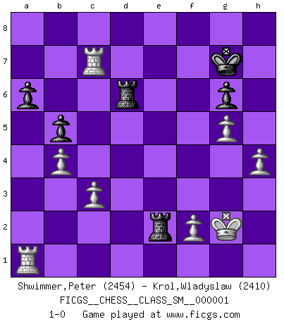 Last move : 1-0 2007 February 5 19:26:14 [Event "FICGS__CHESS__CLASS_SM__000001"] [Site "FICGS"] [Date "2006.05.30"] [Round "1"] [White "Shwimmer,Peter"] [Black "Krol,Wladyslaw"] [Result "1-0"] [WhiteElo "2454"] [BlackElo "2410"] 1.e4 e5 2.Nf3 Nc6 3.Bb5 a6 4.Ba4 Nf6 5.O-O Bc5 6.c3 Ng4 7.d4 Ba7 8.h3 h5 9.Na3 Qf6 10.d5 Nd8 11.d6 Ne6 12.dxc7 b5 13.Bb3 Bb7 14.Qe2 Nf4 15.Bxf4 Qxf4 16.Rae1 Rc8 17.Bd5 Rxc7 18.Bxb7 Rxb7 19.Nc2 Nf6 20.Nb4 O-O 21.Nd3 Qh6 22.Nfxe5 Rb6 23.Nf3 d5 24.exd5 Nxd5 25.Nfe5 Rd8 26.Nb4 Rbd6 27.Nxf7 Kxf7 28.Nxd5 Rxd5 29.Qe7+ Kg8 30.Qxa7 Rd2 31.b4 Rxa2 32.Qc5 Rad2 33.Re5 Qd6 34.Rxh5 Qxc5 35.Rxc5 Re8 36.g4 Rc2 37.Kg2 Rd8 38.Ra1 Rd6 39.g5 Re2 40.h4 g6 41.Rc8+ Kg7 42.Rc7+ 1-0 Ruy Lopez : Moeller defense Kingside Castling by player White (move 5) Kingside Castling by player Black (move 20) Player White won this chess game. Follow this game move after move (download)I still hope to kill Fischer. (Boris Spassky) Irgendwie scheint mir sonntags früh um 9 Uhr der Killerinstinkt verloren gegangen zu sein. (Alexej Shirov) Un jugador que es sorprendido, esta derrotado a medias. (Proverbio) Dans le domaine de la peinture, de la gravure et de la sculpture, dès la première décennie de notre siècle, les artistes abandonnent la représentation de la partie d'échecs pour se concentrer sur les pièces, sur les échiquiers et sur toutes les variations auxquelles les unes et les autres peuvent donner lieu. On passe en quelque sorte d'un thème social à un thème musical (au sens de la musica médiévale, c'est-à-dire d'une notion qui inclue le rythme, l'harmonie, la construction et la déconstruction, etc.). Graphiquement et picturalement, l'échiquier apparaît comme une structure ouverte, dynamique, d'une richesse infinie, autorisant toutes les combinatoires et débouchant sur des mouvements et des rythmes de nature exponentielle. (Michel Pastoureau) Imagination is more important than knowledge. Knowledge is limited. Imagination encircles the world. (Albert Einstein)