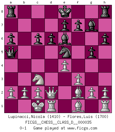 Last move : 0-1 2007 July 4 3:44:31 [Event "FICGS__CHESS__CLASS_D__000035"] [Site "FICGS"] [Date "2007.03.07"] [Round "1"] [White "Lupinacci,Nicola"] [Black "Flores,Luis"] [Result "0-1"] [WhiteElo "1410"] [BlackElo "1700"] 1.e4 c5 2.Nf3 d6 3.d4 cxd4 4.Nxd4 Nf6 5.Nc3 a6 6.Be3 Ng4 7.Bg5 h6 8.Bh4 g5 9.Bg3 Bg7 10.Qd2 Nc6 11.Nxc6 bxc6 12.f3 Ne5 13.O-O-O Be6 14.Bf2 Qa5 0-1 This chess game has been lost on time (started : 2007.03.07 15:21:31) Sicilian : Najdorf, Byrne (English) attack Queenside Castling by player White (move 13) Player Black won this chess game. Follow this game move after move (download)Chess is a more highly symbolic game, but the aggressions are therefore even more frankly represented in the play. It probably began as a war game; that is, the representation of a miniature battle between the forces of two kingdoms. (Karl Meninger) Sie bekommen vielleicht den Eindruck, dass die Spitzenspieler überhaupt gar nicht so stark sind. Aber das stimmt nicht. Es ist eine Illusion. Mit einem Computer an der Seite ist es sehr leicht, Urteile zu fällen, aber wenn man alleine am Brett sitzt, sieht die Sache ganz anders aus. (Vladimir Kramnik) El Ajedrez es realmente noventa y nueve por ciento calculación. (Soltis) Vouloir jouer aux échecs contre soi-même est aussi paradoxal que vouloir marcher sur son ombre. (Stefan Zweig) It's not the size of the dog in the fight, it's the size of the fight in the dog. (Mark Twain)