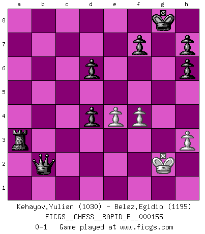 Last move : 0-1 2015 November 8 6:15:27 [Event "FICGS__CHESS__RAPID_E__000155"] [Site "FICGS"] [Date "2015.07.22"] [Round "1"] [White "Kehayov,Yulian"] [Black "Belaz,Egidio"] [Result "0-1"] [WhiteElo "1030"] [BlackElo "1195"] 1.e4 c5 2.c4 Nc6 3.Nf3 e5 4.Be2 Nf6 5.d3 Be7 6.O-O O-O 7.b3 b6 8.Nc3 d6 9.Bg5 a6 10.Nd5 Ra7 11.Nxf6+ Bxf6 12.Bxf6 Qxf6 13.h3 Qg6 14.Nh4 Qg5 15.Bg4 Qxh4 16.Bxc8 Rxc8 17.Qd2 Nd4 18.b4 b5 19.cxb5 axb5 20.bxc5 Rxc5 21.Kh2 Rc2 22.Qe3 Re2 23.g3 Rxe3 24.gxh4 Rxd3 25.a4 bxa4 26.Rfd1 Rxd1 27.Rxd1 a3 28.Rxd4 exd4 29.h5 a2 30.h6 gxh6 31.Kg3 a1Q 32.f4 Ra3+ 33.Kg2 Qb2+ 0-1 This chess game has been lost on time (started : 2015.07.22 21:55:24) Sicilian defense Kingside Castling by player White (move 6) Kingside Castling by player Black (move 6) Promotion Queen by player Black (move 31) Player Black won this chess game. Follow this game move after move (download)The isolated Pawn casts gloom over the entire chessboard. (Aaron Nimzovich) Der Verteidiger gebe der Gewalt nach, aber nur der Gewalt. Er schaffe sich nicht freiwillig, etwa aus Blindheit oder aus Schrecken, irgendwelche Schwächen. Er lasse sich nicht bluffen. (Emanuel Lasker) Hasta este punto, las blancas han seguido un análisis bien conocido. Pero ahora el hace un error fatal: empieza a usar su propia cabeza. (Siegbert Tarrasch) Horreur, mais aussi harmonie suprême : qu'y avait-il en effet au monde en dehors des échecs ? Le brouillard, l'inconnu, le non-être... (Vladimir Nabokov) Perception is reality. (Immanuel Kant)