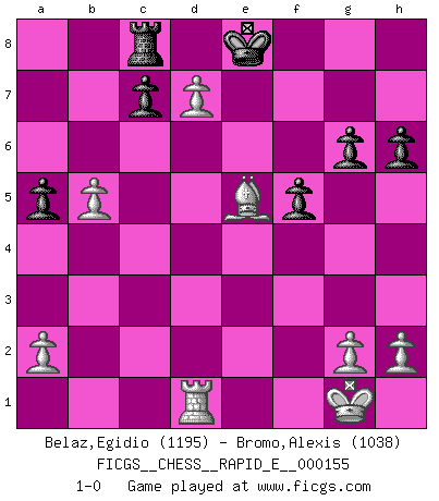 Last move : 1-0 2015 August 21 19:58:43 [Event "FICGS__CHESS__RAPID_E__000155"] [Site "FICGS"] [Date "2015.07.22"] [Round "1"] [White "Belaz,Egidio"] [Black "Bromo,Alexis"] [Result "1-0"] [WhiteElo "1195"] [BlackElo "1038"] 1.e4 e5 2.Nf3 Nc6 3.Bc4 h6 4.O-O Nf6 5.Re1 a6 6.Nc3 Bb4 7.Nd5 Nxd5 8.Bxd5 d6 9.Bxc6+ bxc6 10.c3 Ba5 11.b4 Bb6 12.d4 exd4 13.cxd4 d5 14.exd5 Kf8 15.dxc6 Bg4 16.Qd3 Bxf3 17.Qxf3 Bxd4 18.Rb1 Qf6 19.Qg3 Rc8 20.Bf4 Bb6 21.b5 a5 22.Re2 g6 23.Be5 Bxf2+ 24.Qxf2 Qxf2+ 25.Rxf2 Rh7 26.Rd1 f5 27.Rfd2 Ke8 28.Rd7 Rxd7 29.cxd7+ 1-0 King's pawn game Kingside Castling by player White (move 4) Player White won this chess game. Follow this game move after move (download)Mistrust is the most necessary characteristic of the Chess player. (Siegbert Tarrasch) Die Arbeit ist etwas Unnatürliches. Die Faulheit allein ist göttlich. (Anatole France) El Ajedrez es en su esencia, un juego. En su forma, un arte. Y en su ejecución, una ciencia. (Baron Tassilo) Les pièces de l'échiquier étaient impitoyables. Elles le retenaient, elles l'absorbaient. Il y avait de l'horreur en cela, mais aussi une harmonie unique. Car, qu'y a-t-il dans le monde, à part les échecs ? (V. Nabokov) The ultimate in disposing one's troops is to be without ascertainable shape. Then the most penetrating spies cannot pry in nor can the wise lay plans against you. (Sun Tzu)