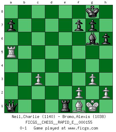 Last move : 0-1 2015 August 9 11:21:56 [Event "FICGS__CHESS__RAPID_E__000155"] [Site "FICGS"] [Date "2015.07.22"] [Round "1"] [White "Neil,Charlie"] [Black "Bromo,Alexis"] [Result "0-1"] [WhiteElo "1140"] [BlackElo "1038"] 1.d4 d5 2.Nf3 h6 3.g3 Nc6 4.Bg2 Bf5 5.c3 Nf6 6.O-O e6 7.Nbd2 Bd6 8.Re1 O-O 9.b3 Re8 10.Nf1 e5 11.dxe5 Nxe5 12.Nxe5 Bxe5 13.Bb2 c6 14.Ne3 Bg6 15.a3 Bd6 16.b4 b5 17.a4 bxa4 18.b5 cxb5 19.Nxd5 Nxd5 20.Qxd5 Re5 21.Qd4 Rb8 22.Ba3 Rb6 23.Bxd6 Qxd6 24.Qxd6 Rxd6 25.Rad1 Rxd1 26.Rxd1 Rxe2 27.Rd5 Re1+ 28.Bf1 a3 29.Rxb5 a2 30.Ra5 a1Q 0-1 Queen's pawn game Kingside Castling by player White (move 6) Kingside Castling by player Black (move 8) Promotion Queen by player Black (move 30) Player Black won this chess game. Follow this game move after move (download)He who fears an isolated Queen's Pawn should give up Chess. (Siegbert Tarrasch) Das Zentrum ist der Balkan des Schachbretts - Kriegshandlungen können in jedem Moment ausbrechen. (Aaron Nimzowitsch) El Ajedrez es un expediente tonto que hace creer a la gente inactiva que hacen una cosa muy astuta cuando solamente estan perdiendo su tiempo. (George Bernard Shaw) Le moment que je préfère le plus dans une rencontre, c'est celui où je sens que la personnalité de l'adversaire se brise. (Robert Fischer) Be who you are, and say what you feel because those who mind don't matter, and those who matter don't mind. (Dr Seuss)