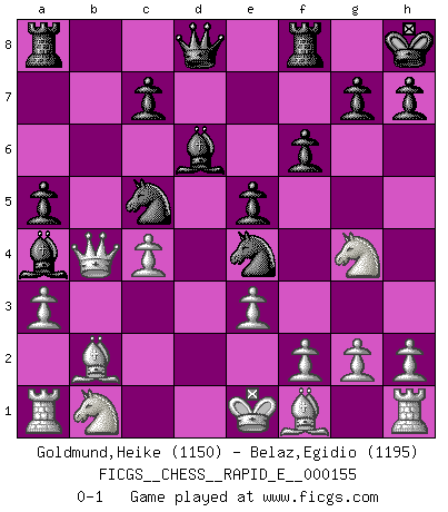 Last move : 0-1 2015 September 2 22:17:31 [Event "FICGS__CHESS__RAPID_E__000155"] [Site "FICGS"] [Date "2015.07.22"] [Round "1"] [White "Goldmund,Heike"] [Black "Belaz,Egidio"] [Result "0-1"] [WhiteElo "1150"] [BlackElo "1195"] 1.b4 e6 2.Bb2 Nf6 3.a3 d5 4.e3 Bd6 5.Nf3 Nc6 6.b5 Na5 7.d3 Bd7 8.c4 O-O 9.Ne5 Be8 10.Nf3 dxc4 11.Qa4 Nb3 12.Ra2 Nc5 13.Qc2 Bxb5 14.dxc4 Bc6 15.Ne5 Ba4 16.Qd2 Bb3 17.Ra1 Nfe4 18.Qd4 f6 19.Ng4 e5 20.Qd5+ Kh8 21.Qxb7 Ba4 22.Qb4 a5 0-1 Polish (Sokolsky) opening Kingside Castling by player Black (move 8) Player Black won this chess game. Follow this game move after move (download)Many have become Chess Masters, no one has become the Master of Chess. (Siegbert Tarrasch) Stelle das Brett so, daß die Sonne in die Augen deines Gegners scheint. (Ruy López) Yo siempre he tenido un ligero sentimiento de lástima por una persona que no tiene conocimiento del Ajedrez. (Siegbert Tarrasch) Les échecs c'est le défi de l'alpiniste, toujours plus haut, prêt à tout pour monter à l'assaut du Roi ennemi. Les échecs, c'est de la musique en mouvement, un ballet majestueux pour les yeux. C'est de la poésie composée par les fantômes du passé qui au même titre que Rimbaud ou Verlaine méritent notre admiration. Les échecs, c'est de la peinture ou le moindre mouvement modifie le tableau pour en faire un Picasso ou un Van Gogh. Les échecs, c'est tout et rien, c'est la vie et la mort. Jjulie33 sur le forum de France-Echecs. If computers get too powerful, we can organize them into committees. That'll do them in. (Anonymous)