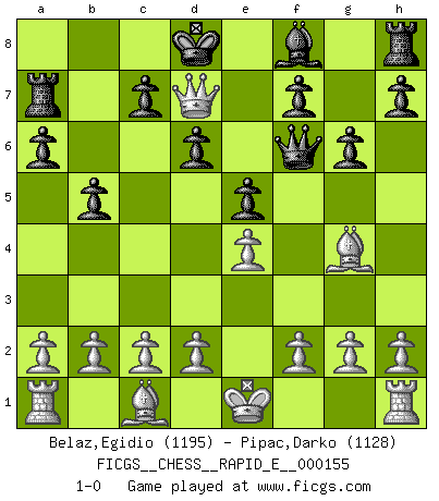 Last move : 1-0 2015 August 4 21:36:37 [Event "FICGS__CHESS__RAPID_E__000155"] [Site "FICGS"] [Date "2015.07.22"] [Round "1"] [White "Belaz,Egidio"] [Black "Pipac,Darko"] [Result "1-0"] [WhiteElo "1195"] [BlackElo "1128"] 1.e4 e5 2.Nf3 d6 3.Bc4 Bg4 4.Nc3 Bxf3 5.Qxf3 Nf6 6.Nd5 a6 7.Nxf6+ Qxf6 8.Qb3 b5 9.Bd3 Nc6 10.Qc3 Kd7 11.Be2 g6 12.Bg4+ Kd8 13.Qxc6 Ra7 14.Qd7+ 1-0 Philidor's defense Player White won this chess game. Follow this game move after move (download)A good player is always lucky. (Jose Raul Capablanca) Deine Wertungszahl - vorausgesetzt einige Jahre schachliche Anstrengung - entspricht etwa dem zehnfachen Deines IQ plus 1000. (Jonathan Levitt) La enorme capacidad mental, en la que sin ella no puede un jugador de Ajedrez existir, es demasiado requerida por el Ajedrez al grado de que nunca podrá liberar su mente de este juego. (Albert Einstein) Pour moi, les échecs ne sont pas un jeu mais un art. (Alexandre Alekhine) I take risks, sometimes patients die, but not taking risks causes more patients to die. So I guess my biggest problem is I've been cursed with the ability to do the math. (Gregory House, House M.D.)