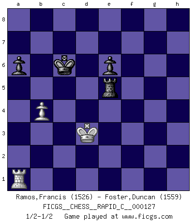 Last move : 1/2-1/2 2015 September 12 13:38:26 [Event "FICGS__CHESS__RAPID_C__000127"] [Site "FICGS"] [Date "2015.07.25"] [Round "1"] [White "Ramos,Francis"] [Black "Foster,Duncan"] [Result "1/2-1/2"] [WhiteElo "1526"] [BlackElo "1559"] 1.e4 e6 2.d4 b6 3.Nc3 Bb7 4.Be3 a6 5.Bd3 g6 6.Qd2 h6 7.f4 Bg7 8.Nf3 Ne7 9.g4 d6 10.Rf1 Qd7 11.O-O-O Nbc6 12.h4 O-O-O 13.Qe2 b5 14.Nxb5 Nb4 15.Nc3 Nxd3+ 16.Qxd3 d5 17.e5 Nc6 18.Na4 Bf8 19.Nd2 Na7 20.Nc5 Bxc5 21.dxc5 Qa4 22.Kb1 Bc6 23.Qb3 Qxb3 24.axb3 d4 25.Bf2 Bb5 26.Nc4 Nc6 27.Rd2 Bxc4 28.bxc4 Kb7 29.Rfd1 g5 30.hxg5 hxg5 31.fxg5 Rh2 32.Bg3 Rh3 33.Rd3 Nb4 34.Rf3 d3 35.cxd3 Rd4 36.Bf2 Rxf3 37.Bxd4 Nxd3 38.Bc3 Nxc5 39.Kc2 Ne4 40.Bd2 Nxd2 41.Rxd2 Rf4 42.Rd7 Rxc4+ 43.Kd3 Rxg4 44.Rxf7 Rxg5 45.Ke4 Rg2 46.Rf6 Re2+ 47.Kd4 c5+ 48.Kxc5 Rxe5+ 49.Kd4 Re2 50.Kd3 Re5 51.Kd4 Re1 52.Kc3 Kc6 53.Kd2 Re5 54.Kd3 Kd6 55.b4 Ke7 56.Rf1 Kd6 57.Ra1 Kc6 1/2-1/2 French defense Queenside Castling by player White (move 11) Queenside Castling by player Black (move 12) 10 pieces endgame at move 44 : White KRPPP , Black KRPPP WHITE : King + 1 Rook 3 Pawns BLACK : King + 1 Rook 3 Pawns 9 pieces endgame at move 44 : White KRPP , Black KRPPP WHITE : King + 1 Rook 2 Pawns BLACK : King + 1 Rook 3 Pawns 8 pieces endgame at move 48 : White KRPP , Black KRPP WHITE : King + 1 Rook 2 Pawns BLACK : King + 1 Rook 2 Pawns 7 pieces endgame at move 48 : White KRP , Black KRPP WHITE : King + 1 Rook 1 Pawn BLACK : King + 1 Rook 2 Pawns This chess game ended in a draw. Follow this game move after move (download)Chess is not like life... it has rules ! (Mark Pasternak) Der Freibauer hat für mich eine Seele, genau wie der Mensch, Wünsche, die unerkannt in ihm schlummern, und Befürchtungen, von deren Existenz er selbst kaum ahnt. (Aaron Nimzowitsch) El Ajedrez es parte de la cultura, y si una cultura esta en decadencia, entonces también el Ajedrez declinará. (Mikhail Botvinnik) Il (Jacob Murray) ne joue pas pour le bon coup, mais pour le meilleur. (Eloi Relange) To be champion requires more than simply being a strong player; one has to be a strong human being as well. (Anatoly Karpov)
