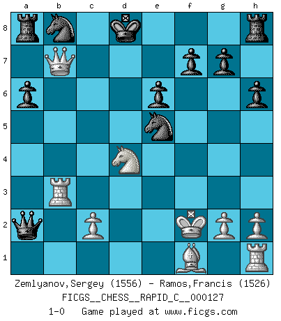 Last move : 1-0 2015 September 20 18:42:10 [Event "FICGS__CHESS__RAPID_C__000127"] [Site "FICGS"] [Date "2015.07.25"] [Round "1"] [White "Zemlyanov,Sergey"] [Black "Ramos,Francis"] [Result "1-0"] [WhiteElo "1556"] [BlackElo "1526"] 1.e4 c5 2.Nf3 d6 3.d4 cxd4 4.Nxd4 Nf6 5.Nc3 a6 6.Be3 Ng4 7.Bc1 Nf6 8.Bg5 e6 9.f4 Qb6 10.Qd2 Qxb2 11.Rb1 Qa3 12.e5 dxe5 13.fxe5 Nfd7 14.Ne4 h6 15.Bh4 Be7 16.Bxe7 Kxe7 17.Rb3 Qxa2 18.Qb4+ Kd8 19.Nd6 Nxe5 20.Nxc8 Kxc8 21.Qxb7+ Kd8 22.Kf2 1-0 Sicilian : Najdorf, Byrne (English) attack Player White won this chess game. Follow this game move after move (download)Becoming successful at Chess allows you to discover your own personality. That's what I want for the kids I teach. (Saudin Robovic) Intelligenz läßt sich nicht am Weg, sondern nur am Ergebnis feststellen. (Garry Kasparov) La maestría del Ajedrez consiste esencialmente en analizar posiciónes de Ajedrez con precisión. (Mikhail Botvinnik) Même si l'adversaire joue le coup analysé précédemment, recommencez l'analyse en voyant la nouvelle position. Première règle de Blumenfeld Sometimes it pays to stay in bed in Monday, rather than spending the rest of the week debugging Monday's code. (Dan Salomon)