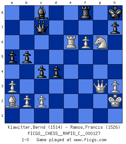 Last move : 1-0 2015 November 5 16:15:57 [Event "FICGS__CHESS__RAPID_C__000127"] [Site "FICGS"] [Date "2015.07.25"] [Round "1"] [White "Klawitter,Bernd"] [Black "Ramos,Francis"] [Result "1-0"] [WhiteElo "1514"] [BlackElo "1526"] 1.e3 Nf6 2.Bc4 g6 3.Ne2 Bg7 4.d3 O-O 5.O-O d5 6.Bb3 c5 7.Nd2 Nc6 8.a3 b5 9.Ba2 Bb7 10.h3 e5 11.f4 Qd7 12.Rb1 c4 13.fxe5 Nxe5 14.Nf3 Nxf3+ 15.Rxf3 a5 16.Rf2 Rad8 17.Bd2 Qc7 18.Qf1 Nh5 19.Nf4 Ng3 20.Qc1 Rfe8 21.Rf3 Nf5 22.g4 Nh4 23.Rf1 Be5 24.Be1 g5 25.Bxh4 gxh4 26.d4 f5 27.dxe5 Qxe5 28.Qe1 d4 29.Qxh4 Qxe3+ 30.Qf2 Qe4 31.Kh2 Kh8 32.Rbe1 Qc6 33.gxf5 Rg8 34.Re6 Qc7 35.Rg1 Bc8 36.Rxg8+ Kxg8 37.Qg3+ Qg7 38.Qh4 Rf8 39.f6 Qc7 40.Qg3+ Kh8 41.Ng6+ 1-0 Van't Kruijs Opening Kingside Castling by player Black (move 4) Kingside Castling by player White (move 5) Player White won this chess game. Follow this game move after move (download)When I asked Fischer why he had not played a certain move in our game, he replied: 'Well, you laughed when I wrote it down !' (Mikhail Tal) Ich glaube nicht an Psychologie, ich glaube an gute Züge. (Robert James Fischer) Fischer deseaba darle a los Rusos una sopa de su propia medicina. (Larry Evans) Nous sommes les pions de la mystérieuse partie d'Echecs jouée par Dieu. Il nous déplace, nous arrête, nous pousse encore, puis nous lance un à un dans la boîte du Néant. Epitaphe sur la tombe de David Janowsky (1868-1927). I have opinions of my own - strong opinions - but I don't always agree with them. (George Bush)