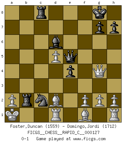 Last move : 0-1 2015 November 2 22:29:32 [Event "FICGS__CHESS__RAPID_C__000127"] [Site "FICGS"] [Date "2015.07.25"] [Round "1"] [White "Foster,Duncan"] [Black "Domingo,Jordi"] [Result "0-1"] [WhiteElo "1559"] [BlackElo "1712"] 1.e4 e5 2.Nf3 f5 3.Nxe5 Qf6 4.Nc4 fxe4 5.Nc3 Qe6 6.Ne3 c6 7.d3 Bb4 8.Bd2 d5 9.d4 Bd6 10.Qe2 Nf6 11.O-O-O b5 12.Nxb5 cxb5 13.Qxb5+ Kf7 14.Qb3 Nc6 15.c4 Nxd4 16.Qa4 Bd7 17.Qa6 Rhc8 18.Kb1 Rc6 19.Qb7 Rb8 20.Qxa7 R6c8 21.cxd5 Qe5 22.Ng4 Nxg4 23.Qxd7+ Kg8 24.Qxg4 Rxb2+ 25.Ka1 Nc2+ 0-1 Latvian counter-gambit Queenside Castling by player White (move 11) Player Black won this chess game. Follow this game move after move (download)Chess is imagination. (David Bronstein) Lisa Lane, amerikanische Schachmeisterin, hatte Fischer einmal als stärksten lebenden Spieler bezeichnet. Antwort: Das ist richtig, aber Lisa Lane ist eigentlich nicht in der Lage, das zu beurteilen. (Robert James Fischer) Un entendimiento a fondo de las continuaciones típicas del mate, hace de las combinaciones de sacrificio mas complicadas conducirlas a ellas no solo sin dificultad, sino casi de una manera natural. (Siegbert Tarrasch) On est toujours la mazette de quelqu'un d'autre. (Anonyme) Everything in life is luck. (Donald Trump)
