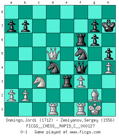 Last move : 0-1 2015 November 28 10:8:26 [Event "FICGS__CHESS__RAPID_C__000127"] [Site "FICGS"] [Date "2015.07.25"] [Round "1"] [White "Domingo,Jordi"] [Black "Zemlyanov,Sergey"] [Result "0-1"] [WhiteElo "1712"] [BlackElo "1556"] 1.g4 d5 2.Bg2 c6 3.h3 e5 4.d4 e4 5.c4 h5 6.g5 Bd6 7.Nc3 Ne7 8.h4 O-O 9.Nh3 Bg4 10.cxd5 cxd5 11.Nf4 Bc7 12.Nb5 Ba5+ 13.Bd2 Bb6 14.Be3 Nbc6 15.Nc3 Rc8 16.Qd2 Re8 17.Rc1 Rc7 18.O-O Rd7 19.g6 fxg6 20.Nh3 Rd6 21.Nb5 Ba5 22.Qd1 Rf6 23.f3 Bxh3 24.Bxh3 exf3 25.exf3 Qb8 26.Bf2 Qf4 27.Bg2 Nf5 28.Qb3 Kh7 29.Qxd5 Bd2 30.Rcd1 Be3 31.Nc3 Ncxd4 32.Bxe3 Rxe3 0-1 Grob's attack Kingside Castling by player Black (move 8) Kingside Castling by player White (move 18) Player Black won this chess game. Follow this game move after move (download)It was clear to me that the vulnerable point of the American Grandmaster (Bobby Fischer) was in double-edged, hanging, irrational positions, where he often failed to find a win even in a won position. (Efim Geller) Ich trinke, ich rauche, ich spiele, ich liebe Frauen aber Fernschach ist ein Laster, das ich nicht habe. (Mikhail Nekhemyevich Tal) ¿Quién es tu oponente esta tarde? Esta tarde mi oponente son las piezas negras. (Akiba Rubinstein) Les échecs c'est le défi de l'alpiniste, toujours plus haut, prêt à tout pour monter à l'assaut du Roi ennemi. Les échecs, c'est de la musique en mouvement, un ballet majestueux pour les yeux. C'est de la poésie composée par les fantômes du passé qui au même titre que Rimbaud ou Verlaine méritent notre admiration. Les échecs, c'est de la peinture ou le moindre mouvement modifie le tableau pour en faire un Picasso ou un Van Gogh. Les échecs, c'est tout et rien, c'est la vie et la mort. Jjulie33 sur le forum de France-Echecs. Don't be irreplaceable, if you can't be replaced, you can't be promoted. (Dan Rotaru)