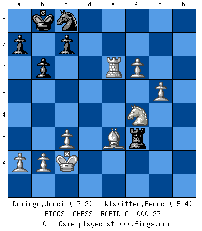 Last move : 1-0 2015 November 17 22:35:10 [Event "FICGS__CHESS__RAPID_C__000127"] [Site "FICGS"] [Date "2015.07.25"] [Round "1"] [White "Domingo,Jordi"] [Black "Klawitter,Bernd"] [Result "1-0"] [WhiteElo "1712"] [BlackElo "1514"] 1.g4 h5 2.g5 g6 3.d4 Bg7 4.Nf3 d6 5.e4 Bg4 6.c3 Nc6 7.Be3 e6 8.Nbd2 Nge7 9.h3 Bxf3 10.Qxf3 h4 11.O-O-O Qd7 12.Kb1 Nc8 13.Be2 Nb6 14.Rhe1 O-O-O 15.d5 Ne5 16.Qg2 Qe8 17.f4 Ned7 18.dxe6 fxe6 19.Qg4 Kb8 20.Nf3 d5 21.Bd3 dxe4 22.Bxe4 Nc4 23.Bf2 Ndb6 24.Rxd8+ Qxd8 25.Qxe6 Nd2+ 26.Kc2 Nxe4 27.Rxe4 Qd6 28.Nxh4 Qxe6 29.Rxe6 Nc8 30.Rxg6 Bf8 31.Re6 Bd6 32.f5 Bf4 33.Ng6 Rxh3 34.Nxf4 Rf3 35.Be3 b6 36.f6 1-0 Grob's attack Queenside Castling by player White (move 11) Queenside Castling by player Black (move 14) Player White won this chess game. Follow this game move after move (download)You may learn much more from a game you lose than from a game you win. You will have to lose hundreds of games before becoming a good player. (Jose Raul Capablanca) Ich las kürzlich ein Buch von Nietzsche. Er sagte Religion verdumme nur die Menschen. Ich stimme zu. (Robert James Fischer) Cuando tu no sabes absolutamente que mas hacer, es tiempo de entrar en pánico. (John van der Wiel) Toutes choses étant égales, c'est la conviction qui gagne. Alliée à une volonté de vaincre, elle sert de détonateur, suscite des idées, disperse les doutes et aide à penser clairement. (Robert Fischer) Knowledge rests not upon truth alone, but upon error also. (Carl G. Jung)