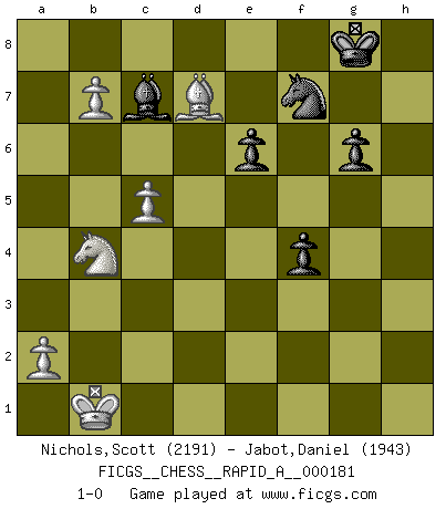 Last move : 1-0 2015 August 25 10:52:42 [Event "FICGS__CHESS__RAPID_A__000181"] [Site "FICGS"] [Date "2015.07.28"] [Round "1"] [White "Nichols,Scott"] [Black "Jabot,Daniel"] [Result "1-0"] [WhiteElo "2191"] [BlackElo "1943"] 1.e4 c5 2.Nf3 d6 3.d4 cxd4 4.Nxd4 Nf6 5.Nc3 g6 6.Be3 Bg7 7.f3 O-O 8.Qd2 Bd7 9.O-O-O Nc6 10.Kb1 Qa5 11.Nb3 Qc7 12.g4 Be6 13.Be2 Rfd8 14.g5 Nd7 15.h4 Nb6 16.h5 d5 17.Bxb6 axb6 18.Nxd5 Bxd5 19.exd5 Qe5 20.c3 e6 21.f4 Qxd5 22.Qe3 Qg2 23.Nc1 Rxd1 24.Rxd1 Bf8 25.Qxb6 Ne7 26.hxg6 hxg6 27.Qe3 Nd5 28.Qf3 Qxf3 29.Bxf3 Nxf4 30.Rd7 Ra6 31.Rxb7 Nh3 32.b4 Nxg5 33.Bg2 f5 34.b5 Ra8 35.Rd7 Rc8 36.b6 f4 37.b7 Rb8 38.Bc6 Nf7 39.Nd3 Bd6 40.c4 Rd8 41.c5 Rxd7 42.Bxd7 Bc7 43.Nb4 1-0 Sicilian : Dragon, Yugoslav attack, 7...O-O Kingside Castling by player Black (move 7) Queenside Castling by player White (move 9) Player White won this chess game. Follow this game move after move (download)Who is your opponent tonight, tonight I am playing against the Black pieces. (Akiba Rubinstein) Fallen sollten polizeilich verboten werden. (Savielly Grigorievitsch Tartakower) En partidas rápidas, el Caballo es mas poderoso que el Alfil. (Vlastimil Hort) On croit qu'il y a plus de mauvais joueurs que de bons joueurs, c'est faux : Il y a autant de joueurs qui gagnent que de joueurs qui perdent. (Philippe Geluck) Philosophers use a language that is already deformed as though by shoes that are too tight. (Ludwig Wittgenstein)