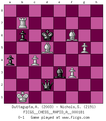 Last move : 0-1 2015 November 7 6:4:53 [Event "FICGS__CHESS__RAPID_A__000181"] [Site "FICGS"] [Date "2015.07.28"] [Round "1"] [White "Duttagupta,Aniruddha"] [Black "Nichols,Scott"] [Result "0-1"] [WhiteElo "2003"] [BlackElo "2191"] 1.c4 Nf6 2.Nc3 e5 3.Nf3 Nc6 4.a3 d5 5.cxd5 Nxd5 6.Qc2 Nxc3 7.dxc3 Qd6 8.e4 Be7 9.Be3 O-O 10.Be2 Kh8 11.g3 Bh3 12.Nd2 f5 13.exf5 Bxf5 14.Ne4 Qg6 15.f3 Bh3 16.Rg1 Be6 17.O-O-O Na5 18.Nd2 Qf7 19.c4 b6 20.Bd3 Rad8 21.Bxh7 Bxc4 22.Be4 Bd5 23.Kb1 Ba2+ 24.Ka1 Rxd2 25.Rxd2 Nb3+ 26.Kxa2 Nd4 27.b3 Nxc2 28.Rxc2 c5 29.Rd1 Rd8 30.Rxd8+ Bxd8 31.h4 Kg8 32.Rd2 Qe8 33.h5 Be7 34.Bd5+ Kh8 35.Be4 a5 36.a4 c4 37.Rd5 Qxh5 38.bxc4 g5 39.Bc1 Qh3 40.Bb2 Kg8 41.g4 Qf1 42.Kb3 Qe1 43.Bc3 Qc1 44.Bb2 Qe3+ 45.Ka2 Kf8 46.Rxe5 Bd6 47.Rf5+ Ke8 48.Bc6+ Ke7 49.Bf6+ Ke6 50.Bd5+ Kd7 51.Rxg5 Qa3+ 52.Kb1 Qd3+ 53.Kb2 Qd2+ 54.Kb1 Bf4 55.Rg7+ Kd6 56.Rb7 Qc1+ 57.Ka2 Qc2+ 58.Ka1 Qxa4+ 59.Kb2 Qb4+ 60.Kc2 Qd2+ 61.Kb1 Be3 62.g5 a4 0-1 This chess game has been lost on time (started : 2015.07.28 6:12:55) English Opening Kingside Castling by player Black (move 9) Queenside Castling by player White (move 17) Player Black won this chess game. Follow this game move after move (download)He who takes the Queen's Knight's Pawn will sleep in the streets. (Anonymous) Deine Wertungszahl - vorausgesetzt einige Jahre schachliche Anstrengung - entspricht etwa dem zehnfachen Deines IQ plus 1000. (Jonathan Levitt) Todo lo que importa ante el tablero de Ajedrez son buenas jugadas. (Bobby Fischer) C'est une question de caractère, Beaucoup de gens perdent leur motivation très vite. D'autres, ils sont rares, peuvent la conserver très longtemps. J'aime les échecs, encore aujourd'hui je suis heureux d'analyser des parties. J'aime toujours gagner, je déteste encore perdre. Bien jouer est important pour mon intégrité intellectuelle et morale. Et puis les échecs vivent en ce moment une période historique grâce à Internet. Ils se développent dans les systèmes éducatifs à travers le monde. Ils sortent de leur ghetto, et c'est mon rôle de mener à bien cette révolution. (Gary Kasparov) Bobby never cared about money, though. His only desire was to prove that his choices were correct: He wanted chess to be important because he was a chess player, and he wanted to be important. Bobby knew money was important, but he didn't have a clue why, outside of clothes and status. The only way he could accomplish what he wanted was to fight for a lot of money. Once he got it, he gave it away. He did not know how to spend it. And once he'd become champion, after, essentially, sacrificing his life for it, he didn't know how to spend his time. (Bob Wade)