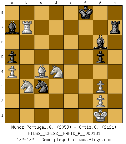 Last move : 1/2-1/2 2015 September 18 2:43:52 [Event "FICGS__CHESS__RAPID_A__000181"] [Site "FICGS"] [Date "2015.07.28"] [Round "1"] [White "Munoz Portugal,Guillermo"] [Black "Ortiz,Clodomiro"] [Result "1/2-1/2"] [WhiteElo "2059"] [BlackElo "2121"] 1.e4 e5 2.Nf3 Nc6 3.Bc4 Nf6 4.d3 Bc5 5.c3 d6 6.O-O a5 7.h3 O-O 8.Bg5 h6 9.Bh4 g5 10.Bg3 Nh5 11.Kh1 Nxg3+ 12.fxg3 g4 13.hxg4 Bxg4 14.Nbd2 Qe7 15.a4 Kh8 16.Nb3 Bb6 17.Qd2 Kh7 18.d4 f6 19.Nh4 Qg7 20.Nf5 Qg5 21.Qxg5 hxg5 22.Ne3 Bc8 23.Nd5 Ba7 24.Rxf6 Rxf6 25.Nxf6 Kg6 26.Rf1 exd4 27.Ne8 Ne5 28.Rf6 Kh7 29.Nxc7 dxc3 30.bxc3 Rb8 31.Bb5 Bg4 32.Ne8 Bh5 33.Nxd6 Rh8 34.Nf5 Ng4 35.Rd6 Nf2+ 36.Kh2 Bg6 37.Nfd4 Nxe4 38.Rd7 Kg8 39.Kg1 Nxc3 40.Bc4 Kf8 41.Rxb7 Rh7 1/2-1/2 Two knights defense (Modern Bishop's Opening) Kingside Castling by player White (move 6) Kingside Castling by player Black (move 7) This chess game ended in a draw. Follow this game move after move (download)Any material change in a position must come about by mate, a capture, or a Pawn promotion. (Purdy) Alle offensichtlichen Züge sehen nach dem Spiel in der Analyse verdächtig aus. (Viktor Kortschnoi) Combinaciones deslumbrantes son para la mayoría, mover madera es para los pocos. (Georg Kieninger) Le temps de noter son nom sur la feuille de partie, j'étais déjà en zeitnot ! D'un modeste amateur apparié lors de la première ronde d'un open contre le grand-maître Azmaïparashvili. Hello Thibault, if I have had a plan (and I had one, I hope), I have forgotten it during the last week... - Hello Heinz-Georg. What do you mean a plan ? (Anonymous players, during a Big Chess game)