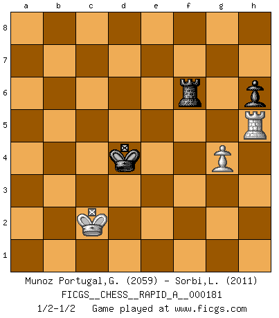 Last move : 1/2-1/2 2015 October 8 11:9:16 [Event "FICGS__CHESS__RAPID_A__000181"] [Site "FICGS"] [Date "2015.07.28"] [Round "1"] [White "Munoz Portugal,Guillermo"] [Black "Sorbi,Luca"] [Result "1/2-1/2"] [WhiteElo "2059"] [BlackElo "2011"] 1.e4 e5 2.Nf3 Nf6 3.Nxe5 d6 4.Nf3 Nxe4 5.d4 d5 6.Bd3 Nc6 7.O-O Be7 8.Nbd2 Nxd2 9.Bxd2 Bg4 10.c3 O-O 11.Re1 Bd6 12.h3 Bh5 13.g3 Kh8 14.Bf5 Ne7 15.Bg4 Bxg4 16.hxg4 Qd7 17.Ne5 Bxe5 18.Rxe5 Rae8 19.Qf3 f6 20.Re2 Nc8 21.Rae1 Rxe2 22.Rxe2 Kg8 23.c4 Ne7 24.Bb4 Nc6 25.Bc5 Rd8 26.g5 dxc4 27.gxf6 Nxd4 28.Bxd4 Qxd4 29.fxg7 b5 30.Re4 Qd1+ 31.Kg2 Qxf3+ 32.Kxf3 Rd2 33.a4 a6 34.Re7 c5 35.Rc7 Rxb2 36.Rxc5 Kxg7 37.Ke4 bxa4 38.Ke3 Rb3+ 39.Kd2 a3 40.Rxc4 Kf6 41.Ra4 Ke5 42.g4 Kd5 43.Rxa6 Kc4 44.Kc1 Rf3 45.Ra7 Rxf2 46.Rxa3 h6 47.Rh3 Rf6 48.Kc2 Kd4 49.Rh5 1/2-1/2 Petrov : Classical attack Kingside Castling by player White (move 7) Kingside Castling by player Black (move 10) 10 pieces endgame at move 37 : White KRPP , Black KRPPPP WHITE : King + 1 Rook 2 Pawns BLACK : King + 1 Rook 4 Pawns 9 pieces endgame at move 40 : White KRPP , Black KRPPP WHITE : King + 1 Rook 2 Pawns BLACK : King + 1 Rook 3 Pawns 8 pieces endgame at move 43 : White KRPP , Black KRPP WHITE : King + 1 Rook 2 Pawns BLACK : King + 1 Rook 2 Pawns 7 pieces endgame at move 45 : White KRP , Black KRPP WHITE : King + 1 Rook 1 Pawn BLACK : King + 1 Rook 2 Pawns 6 pieces endgame at move 46 : White KRP , Black KRP WHITE : King + 1 Rook 1 Pawn BLACK : King + 1 Rook 1 Pawn This chess game ended in a draw. Follow this game move after move (download)Chess is a sea in which a gnat may drink and an elephant may bathe. (Hindu proverb) Über Frauen: Chess is better. (Robert James Fischer) Personalmente, yo prefiero mirar hacia el futuro en donde un programa de computadora gane el título mundial de Ajedrez. La humanidad necesita una lección de humildad. (Richard Dawkings) Il n'y a plus de joueurs du niveau de Jacob Murray dont la seule quête est le beau jeu, le plaisir de voir les pièces construire quelque chose. Sur 10 idées à la minute, 9 seront sans intérêt, la dernière s'avèrera géniale. (Christian Bauer) Two beer, or not two beer. (Unknown)