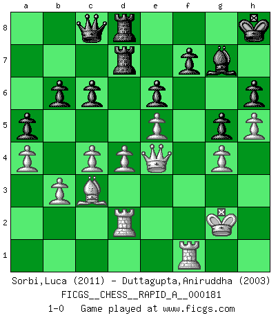 Last move : 1-0 2015 November 5 5:31:35 [Event "FICGS__CHESS__RAPID_A__000181"] [Site "FICGS"] [Date "2015.07.28"] [Round "1"] [White "Sorbi,Luca"] [Black "Duttagupta,Aniruddha"] [Result "1-0"] [WhiteElo "2011"] [BlackElo "2003"] 1.e4 c6 2.d4 d5 3.Nc3 dxe4 4.Nxe4 Bf5 5.Ng3 Bg6 6.h4 h6 7.Nf3 Nd7 8.Bd3 Bxd3 9.Qxd3 e6 10.Bf4 Ngf6 11.O-O Be7 12.c4 O-O 13.Rad1 Qa5 14.b3 Rfe8 15.Rfe1 Rad8 16.Qc2 Ng4 17.Ne4 Ndf6 18.Bd2 Qc7 19.Nxf6+ Nxf6 20.Bc3 a5 21.a4 b6 22.g3 Ng4 23.Kg2 Bd6 24.Kh3 Nf6 25.Qe2 Be7 26.Ne5 Nd7 27.f4 Nxe5 28.fxe5 Bf8 29.Kg2 Re7 30.Rd3 Red7 31.Qe4 Bc5 32.Red1 Ba3 33.g4 g6 34.h5 g5 35.Re3 Qb7 36.Qf3 Qc8 37.Red3 Bf8 38.Rf1 Kh8 39.Qe4 Bg7 40.Rd2 1-0 This chess game has been lost on time (started : 2015.07.28 6:12:55) Caro-Kann : Classical, 7...Nd7 Kingside Castling by player White (move 11) Kingside Castling by player Black (move 12) Player White won this chess game. Follow this game move after move (download)I guess a certain amount of temperament is expected of Chess geniuses. (Ron Gross) Schach verlangt totale Konzentration. (Robert James Fischer) Siempre es mejor sacrificar los hombres de tu oponente. (Savielly Tartakower) Je menace de comprendre la position. (Anonyme) The good fighters of old first put themselves beyond the possibility of defeat, and then waited for an opportunity of defeating the enemy. (Sun Tzu)
