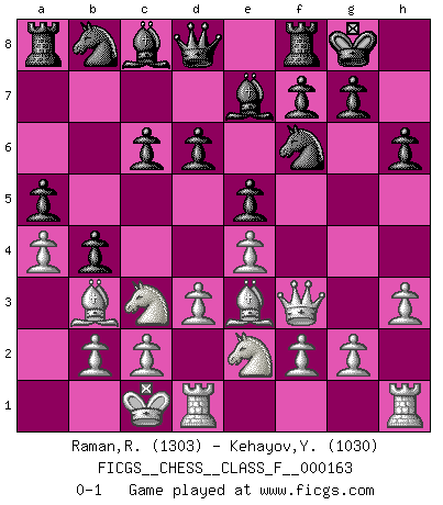 Last move : 0-1 2015 November 12 6:28:57 [Event "FICGS__CHESS__CLASS_F__000163"] [Site "FICGS"] [Date "2015.07.28"] [Round "1"] [White "Raman,Ranganathan"] [Black "Kehayov,Yulian"] [Result "0-1"] [WhiteElo "1303"] [BlackElo "1030"] 1.e4 e5 2.Nc3 d6 3.Qf3 Nf6 4.h3 Be7 5.Bc4 O-O 6.Nge2 h6 7.d3 a6 8.Be3 c6 9.O-O-O b5 10.Bb3 a5 11.a4 b4 0-1 Vienna game Kingside Castling by player Black (move 5) Queenside Castling by player White (move 9) Player Black won this chess game. Follow this game move after move (download)A win by an unsound combination, however showy, fills me with artistic horror. (Wilhelm Steinitz) Es ist schade, dass viele Schachsportler vergessen, wie wichtig Auftreten und angemessene Kleidung sind. (Alexandra Kosteniuk) Ser exitoso en el Ajedrez te permite descubrir tu propia personalidad. Eso es lo que deseo para los niños de mi clase. (Saudin Robovic) A ce moment-là, je menaçais de comprendre la position ! (Clément L'Heureux) A government big enough to give you everything you want is strong enough to take everything you have. (Thomas Jefferson)