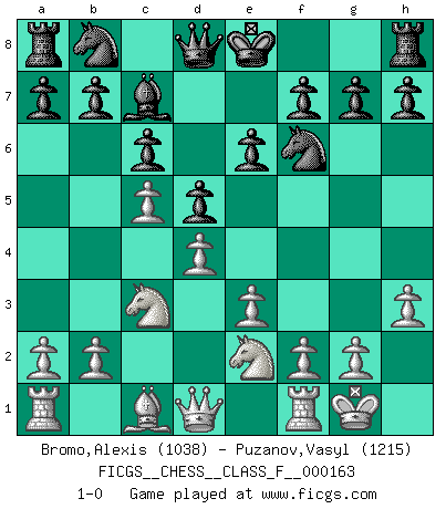 Last move : 1-0 2015 September 9 0:59:1 [Event "FICGS__CHESS__CLASS_F__000163"] [Site "FICGS"] [Date "2015.07.28"] [Round "1"] [White "Bromo,Alexis"] [Black "Puzanov,Vasyl"] [Result "1-0"] [WhiteElo "1038"] [BlackElo "1215"] 1.d4 d5 2.c4 c6 3.e3 Nf6 4.Nc3 Bg4 5.Be2 Bxe2 6.Ngxe2 e6 7.h3 Bd6 8.c5 Bc7 9.O-O 1-0 This chess game has been lost on time (started : 2015.07.28 8:13:25) QGD Slav defense Kingside Castling by player White (move 9) Player White won this chess game. Follow this game move after move (download)Strategy requires thought, tactics require observation. (Max Euwe) Im Spitzenschach von heute geht es nur um Vorbereitung, um tiefgründige, sorgfältige Eröffnungsvorbereitung. (Nigel Short) La mitad de las variaciones que son calculadas en una partida de torneo, resultan ser completamente superfluas. Desafortunadamente, nadie sabe por adelantado cual mitad. (Jan Tinman) La tactique est l'élément le plus important du milieu de jeu. (Siegbert Tarrasch) Life doesn't imitate art, it imitates bad television. (Woody Allen)