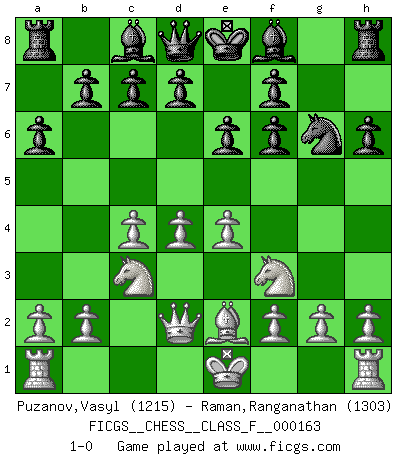 Last move : 1-0 2015 October 16 13:57:17 [Event "FICGS__CHESS__CLASS_F__000163"] [Site "FICGS"] [Date "2015.07.28"] [Round "1"] [White "Puzanov,Vasyl"] [Black "Raman,Ranganathan"] [Result "1-0"] [WhiteElo "1215"] [BlackElo "1303"] 1.e4 Nc6 2.d4 e6 3.c4 Nf6 4.Nc3 a6 5.Nf3 Ne7 6.Bg5 h6 7.Bxf6 gxf6 8.Be2 Ng6 9.Qd2 1-0 This chess game has been lost on time (started : 2015.07.28 8:13:25) KP : Nimzovich defense Player White won this chess game. Follow this game move after move (download)An attack on the wing should be met by play in the center. (Nimzovitch) Je mehr wir mit Computern analysieren, desto mehr glauben wir an Verteidigung. (Vladimir Kramnik) Personalmente, yo prefiero mirar hacia el futuro en donde un programa de computadora gane el título mundial de Ajedrez. La humanidad necesita una lección de humildad. (Richard Dawkings) 'L'échange des dames est un coup dur pour les deux adversaires...' Un journaliste lors d'une partie du match Spassky-Fischer Children in the dark cause accidents, accidents in the dark cause children. (Unknown)