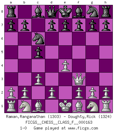 Last move : 1-0 2015 September 8 10:42:52 [Event "FICGS__CHESS__CLASS_F__000163"] [Site "FICGS"] [Date "2015.07.28"] [Round "1"] [White "Raman,Ranganathan"] [Black "Doughty,Rick"] [Result "1-0"] [WhiteElo "1303"] [BlackElo "1324"] 1.e4 c5 2.Qf3 Nc6 3.c3 1-0 This chess game has been lost on time (started : 2015.07.28 8:13:25) Sicilian defense Player White won this chess game. Follow this game move after move (download)All my games are real. (Bobby Fischer) Computer sind die einzigen Gegner, die nicht immer eine Ausrede auf Lager haben, wenn sie gegen mich verlieren. (Robert James Fischer) No todos los artistas son jugadores de Ajedrez, pero todos los jugadores de Ajedrez son artistas. (Marcel Duchamp) J'ai toujours senti une vague pitié pour l'homme qui ne connaît rien aux échecs, tout comme j'en aurais pour un homme ignorant de l'amour. Les Echecs, comme la musique ou comme l'amour, ont le pouvoir de rendre heureux. (Siegbert Tarrasch) Winning isn't everything... but losing is nothing. (Mednis)