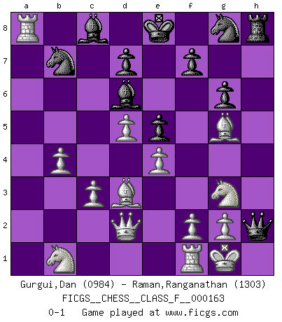 Last move : 0-1 2015 September 1 14:47:19 [Event "FICGS__CHESS__CLASS_F__000163"] [Site "FICGS"] [Date "2015.07.28"] [Round "1"] [White "Gurgui,Dan"] [Black "Raman,Ranganathan"] [Result "0-1"] [WhiteElo "0984"] [BlackElo "1303"] 1.e4 e5 2.Ne2 Nc6 3.d4 Qf6 4.c3 Bd6 5.d5 Na5 6.b3 b5 7.Ng3 g6 8.Bxb5 a6 9.Bd3 Ne7 10.b4 Nb7 11.Bd2 c5 12.a3 h6 13.O-O cxb4 14.axb4 Rg8 15.Bxh6 Rh8 16.Qd2 Ng8 17.Bg5 Qg7 18.Rxa6 Qh7 19.Rxa8 Qxh2+ 0-1 Alapin's Opening Kingside Castling by player White (move 13) Player Black won this chess game. Follow this game move after move (download)A good player is always lucky. (Jose Raul Capablanca) Ein Schachgenie ist jemand der verdammt gut Schach spielt. (Jonathan Levitt) Todo lo que importa ante el tablero de Ajedrez son buenas jugadas. (Bobby Fischer) Les échecs sont un jeu par leur forme, un art par leur essence et une science par sa difficulté d'acquisition. Ils peuvent vous procurer autant de plaisir qu'un bon livre ou une belle musique, mais vous n'aurez une réelle joie que si vous arrivez à bien jouer. (Tigran Petrosian) Wisdom doesn't necessarily come with age. Sometimes age just shows up all by itself. (Tom Wilson)