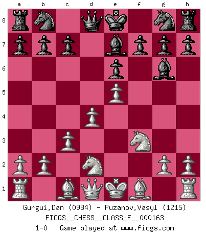 Last move : 1-0 2015 September 29 22:24:5 [Event "FICGS__CHESS__CLASS_F__000163"] [Site "FICGS"] [Date "2015.07.28"] [Round "1"] [White "Gurgui,Dan"] [Black "Puzanov,Vasyl"] [Result "1-0"] [WhiteElo "0984"] [BlackElo "1215"] 1.d4 d5 2.Nd2 Bf5 3.e3 e6 4.f3 Bb4 5.c3 Bd6 6.e4 dxe4 7.fxe4 Bg6 8.e5 Be7 9.Ngf3 1-0 This chess game has been lost on time (started : 2015.07.28 8:13:25) Queen's pawn game Player White won this chess game. Follow this game move after move (download)Chess is a more highly symbolic game, but the aggressions are therefore even more frankly represented in the play. It probably began as a war game; that is, the representation of a miniature battle between the forces of two kingdoms. (Karl Meninger) Dieses schreckliche Gefühl, dass ich gegen eine Maschine spielte, die niemals Fehler macht, zerschmetterte meinen Widerstand. (Mark Taimanov) Observen a Garry Kasparov. Después de una derrota, invariablemente el gana la próxima partida. Prácticamente hace pedazos a su siguiente oponente. Eso es algo que tenemos que aprender a lograr. (Maurice Ashley) Le jeu d'échecs fait naître et fortifie en nous plusieurs qualités précieuses dans le cours de l'existence, telles que la prévoyance, la circonspection, la prudence, et la persévérance. (Benjamin Franklin - 1783, la morale des échecs) There is no instance of a country having benefited from prolonged warfare. (Sun Tzu)