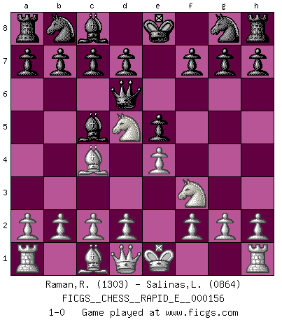Last move : 1-0 2015 September 2 10:18:57 [Event "FICGS__CHESS__RAPID_E__000156"] [Site "FICGS"] [Date "2015.07.28"] [Round "1"] [White "Raman,Ranganathan"] [Black "Salinas,Loreva"] [Result "1-0"] [WhiteElo "1303"] [BlackElo "0864"] 1.e4 e5 2.Nc3 Qf6 3.Nf3 Bc5 4.Nd5 Qd6 5.Bc4 1-0 This chess game has been lost on time (started : 2015.07.28 8:18:18) Vienna game Player White won this chess game. Follow this game move after move (download)Live, lose, and learn, by observing your opponent how to win. (Amber Steenbock) Alle offensichtlichen Züge sehen nach dem Spiel in der Analyse verdächtig aus. (Viktor Kortschnoi) Yo adoro todas la posiciones. Denme una partida posicional difícil, y la jugaré. Pero posiciones totalmente ganadas, no las tolero. (Hein Donner) A ce moment-là, je menaçais de comprendre la position ! (Clément L'Heureux) Programming can only do so much before it becomes too much. (Don Groves)