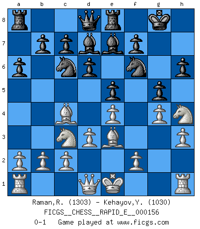 Last move : 0-1 2015 October 9 0:40:17 [Event "FICGS__CHESS__RAPID_E__000156"] [Site "FICGS"] [Date "2015.07.28"] [Round "1"] [White "Raman,Ranganathan"] [Black "Kehayov,Yulian"] [Result "0-1"] [WhiteElo "1303"] [BlackElo "1030"] 1.Nc3 e5 2.Nf3 d6 3.e4 Nf6 4.h3 Be7 5.Bc4 O-O 6.Ng5 h6 7.Nf3 a6 8.d3 Bd7 9.Nh4 Nc6 10.Be3 Re8 11.g4 g5 0-1 This chess game has been lost on time (started : 2015.07.28 8:18:18) Dunst (Sleipner-Heinrichsen) Opening Kingside Castling by player Black (move 5) Player Black won this chess game. Follow this game move after move (download)Openings teach you openings. Endgames teach you chess ! (Stephan Gerzadowicz) Moralische Siege zählen nicht. (Savielly Grigorievitsch Tartakower) Cuando me preguntan: -¿Cual es el secreto que te hace hacer mejores movidas que tus oponentes?, Yo respondo: Me da gusto que me pregunten eso, porque, como veran, hay una simple razón. Yo pienso mis propias movidas y dejo a mi oponente que el piense las suyas. (Alexander Alekhine) Les ravages du H expliquent la différence de niveau entre Tal et Thal [Abergel]. The only thing that matters is the evidence. (Horatio Caine, C.S.I. Miami)