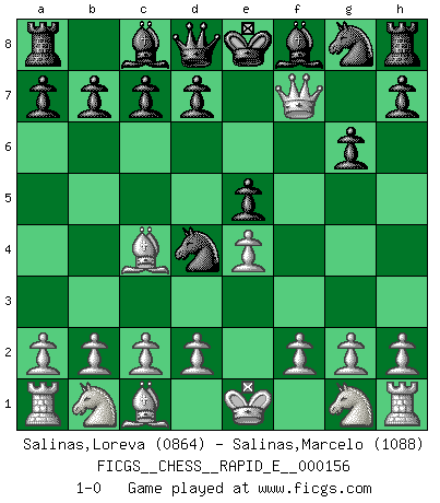Last move : 1-0 2015 August 11 3:24:47 [Event "FICGS__CHESS__RAPID_E__000156"] [Site "FICGS"] [Date "2015.07.28"] [Round "1"] [White "Salinas,Loreva"] [Black "Salinas,Marcelo"] [Result "1-0"] [WhiteElo "0864"] [BlackElo "1088"] 1.e4 Nc6 2.Bc4 e5 3.Qh5 g6 4.Qf3 Nd4 5.Qxf7+ 1-0 KP : Nimzovich defense Player White won this chess game. Follow this game move after move (download)I'm not afraid of Spassky. The world knows I'm the best. You don't need a match to prove it. (Bobby Fischer) Fischer: 'Remis!?' Uhlmann: 'Aber es muss doch dreimal Zugwiederholung sein!' Fischer: 'Sie nehmen das Remis an, wie ich es sage, sonst spiele ich weiter und werde Sie dann schlagen!' (Robert James Fischer) Bobby es el jugador de Ajedrez mas fino que este país jamás haya producido. Su memoria para las movidas, su brillantez en soñar combinaciones y su feróz determinación por la victoria son algo extraño. (John Collins) Les réformistes prétendent que les progrès de la théorie conduiront à la disparition des échecs, et qu'il faut, pour leur rendre vie, en remanier les règles. En réalité, qu'exprime cette affirmation? Le mépris de l'intuition, de l'imagination et de tous les autres éléments qui font des échecs un art. (Alexander Alekhine) I find television to be very educating. Every time somebody turns on the set, I go in the other room and read a book. (Groucho Marx)