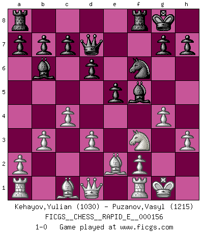 Last move : 1-0 2015 October 23 15:21:56 [Event "FICGS__CHESS__RAPID_E__000156"] [Site "FICGS"] [Date "2015.07.28"] [Round "1"] [White "Kehayov,Yulian"] [Black "Puzanov,Vasyl"] [Result "1-0"] [WhiteElo "1030"] [BlackElo "1215"] 1.e4 e5 2.Nf3 Nc6 3.Be2 Bc5 4.O-O d6 5.d3 f5 6.exf5 Bxf5 7.Nbd2 Nf6 8.h3 O-O 9.c4 Nd4 10.Nxd4 Bxd4 11.Nf3 Bb6 12.b3 Qd7 13.g4 1-0 This chess game has been lost on time (started : 2015.07.28 8:18:18) Inverted Hungarian Kingside Castling by player White (move 4) Kingside Castling by player Black (move 8) Player White won this chess game. Follow this game move after move (download)He who takes the Queen's Knight's Pawn will sleep in the streets. (Anonymous) Du weisst es gibt ein Problem mit Computern und Fernschach, wenn jeder eine Rating von 2450 hat. (John Christen Knudsen) Aquel que teme a un Peón de Reina aislado, debería de retirarse del Ajedrez. (Siegbert Tarrasch) Il n'y a plus de joueurs du niveau de Jacob Murray dont la seule quête est le beau jeu, le plaisir de voir les pièces construire quelque chose. Sur 10 idées à la minute, 9 seront sans intérêt, la dernière s'avèrera géniale. (Christian Bauer) Hold em is to stud what chess is to checkers. (Johnny Moss)