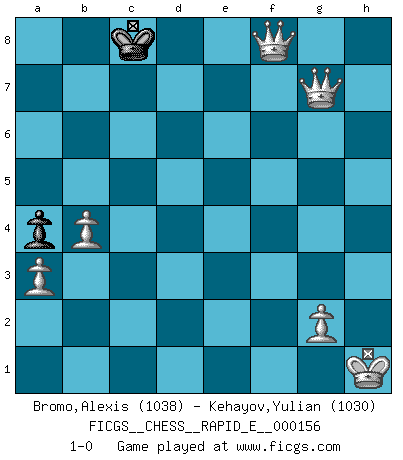 Last move : 1-0 2015 November 26 21:9:27 [Event "FICGS__CHESS__RAPID_E__000156"] [Site "FICGS"] [Date "2015.07.28"] [Round "1"] [White "Bromo,Alexis"] [Black "Kehayov,Yulian"] [Result "1-0"] [WhiteElo "1038"] [BlackElo "1030"] 1.d4 d5 2.c4 dxc4 3.Nc3 e6 4.a3 Nf6 5.h3 Be7 6.e4 O-O 7.Bxc4 c6 8.Nf3 b5 9.Bb3 a5 10.O-O a4 11.Ba2 Na6 12.Re1 Re8 13.e5 Nd5 14.Nxd5 cxd5 15.b4 Bb7 16.Be3 h6 17.Rc1 Rc8 18.Rxc8 Qxc8 19.Qe2 Qd7 20.Rc1 Rc8 21.Rxc8+ Bxc8 22.Nh2 f6 23.exf6 Bxf6 24.Bb1 Qd6 25.Ng4 Bd8 26.Ne5 Bf6 27.Qg4 Bxe5 28.dxe5 Qxe5 29.Bxh6 Nc7 30.f4 Qd4+ 31.Kh2 Ne8 32.Bg6 Nf6 33.Qg5 Nh7 34.Qd8+ Nf8 35.Qe7 Nxg6 36.Qe8+ Kh7 37.Qxc8 Nxf4 38.Bxf4 Qxf4+ 39.Kh1 Qc1+ 40.Qxc1 g6 41.Qc6 Kg7 42.Qxe6 Kf8 43.Qxd5 Kg7 44.Qxb5 g5 45.Qxg5+ Kf7 46.h4 Ke6 47.h5 Kf7 48.h6 Ke6 49.h7 Kf7 50.h8Q Ke6 51.Qh8f6+ Kd7 52.Qg5g7+ Kc8 53.Qf6f8+ 1-0 Queen's gambit accepted Kingside Castling by player Black (move 6) Kingside Castling by player White (move 10) 10 pieces endgame at move 43 : White KQPPPP , Black KPPP WHITE : King + 1 Queen 4 Pawns BLACK : King + 3 Pawns 9 pieces endgame at move 44 : White KQPPPP , Black KPP WHITE : King + 1 Queen 4 Pawns BLACK : King + 2 Pawns 8 pieces endgame at move 45 : White KQPPPP , Black KP WHITE : King + 1 Queen 4 Pawns BLACK : King + 1 Pawn Promotion Queen by player White (move 50) Player White won this chess game. Follow this game move after move (download)In life, as in Chess, one's own Pawns block one's way. A man's very wealth, ease, leisure, children, books, which should help him to win, more often checkmate him. (Charles Buxton) Der Partner hat auch seine Existenzberechtigung. (Savielly Grigorievitsch Tartakower) Los finales de Peón son del Ajedrez lo que el cesped es del Golf. (Cecil Purdy) Le jeu d'échecs fait naître et fortifie en nous plusieurs qualités précieuses dans le cours de l'existence, telles que la prévoyance, la circonspection, la prudence, et la persévérance. (Benjamin Franklin - 1783, la morale des échecs) Faith : not wanting to know what is true. (Friedrich Nietzsche)